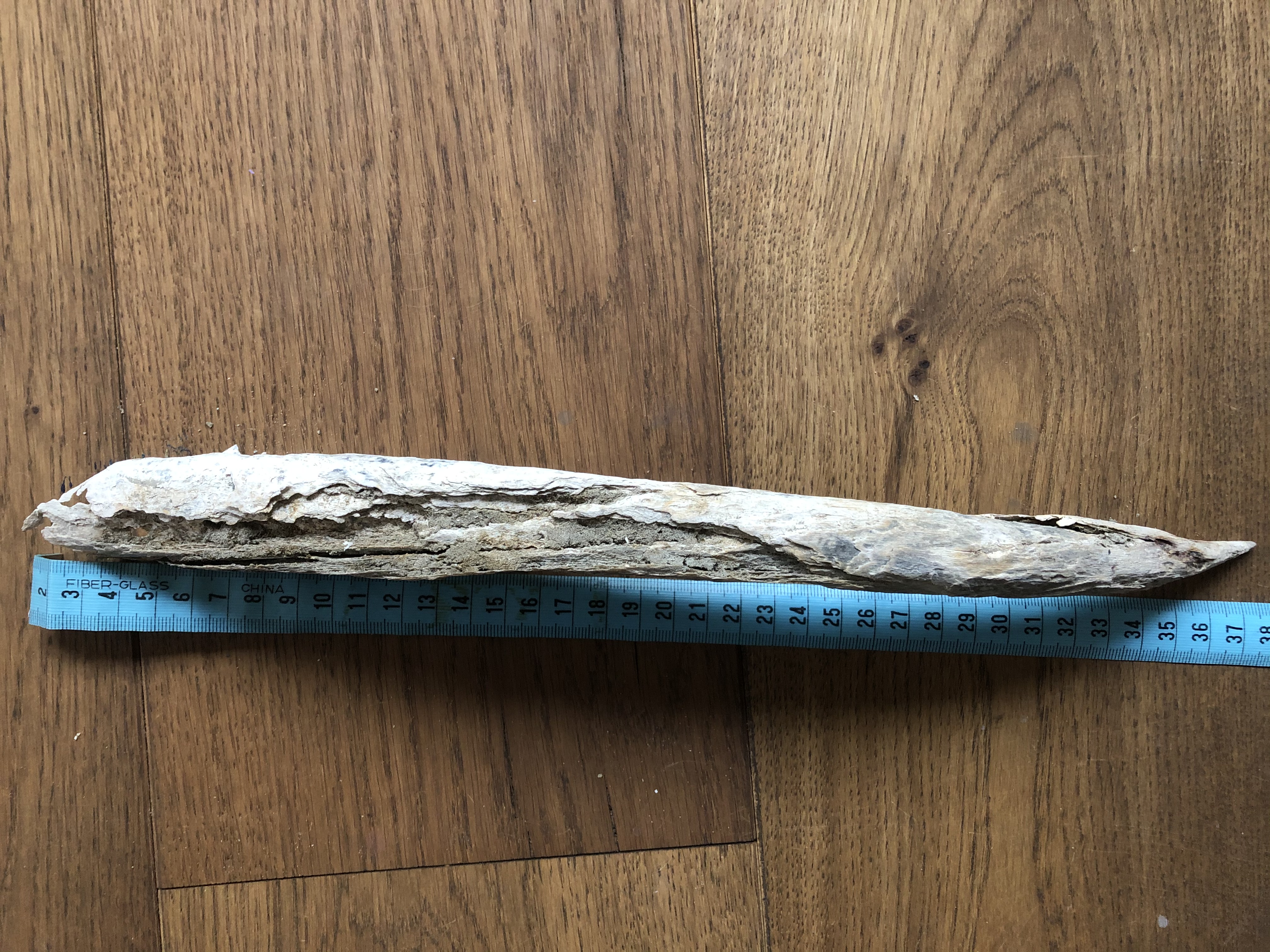 Dit grote botstuk werd onlangs gevonden op de Balg, Schiermonnikoog. Hoornpit van????????? Of iets heel anders???