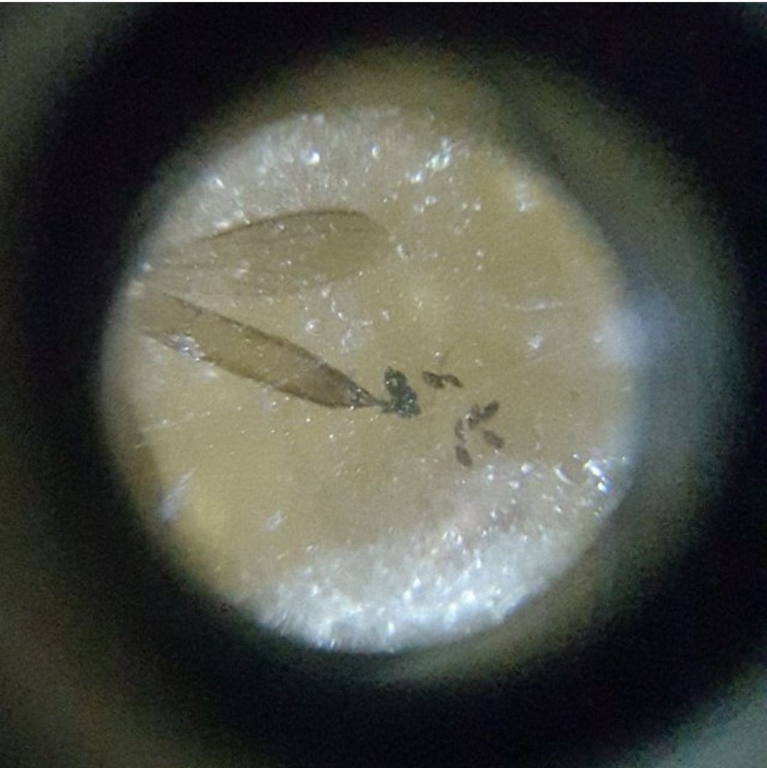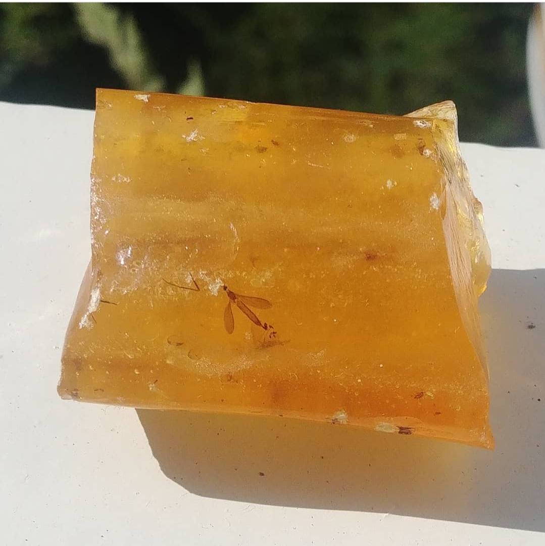 Een stuk Copal met een mug die eieren legt als insluitsel, samen met wat andere insecten.