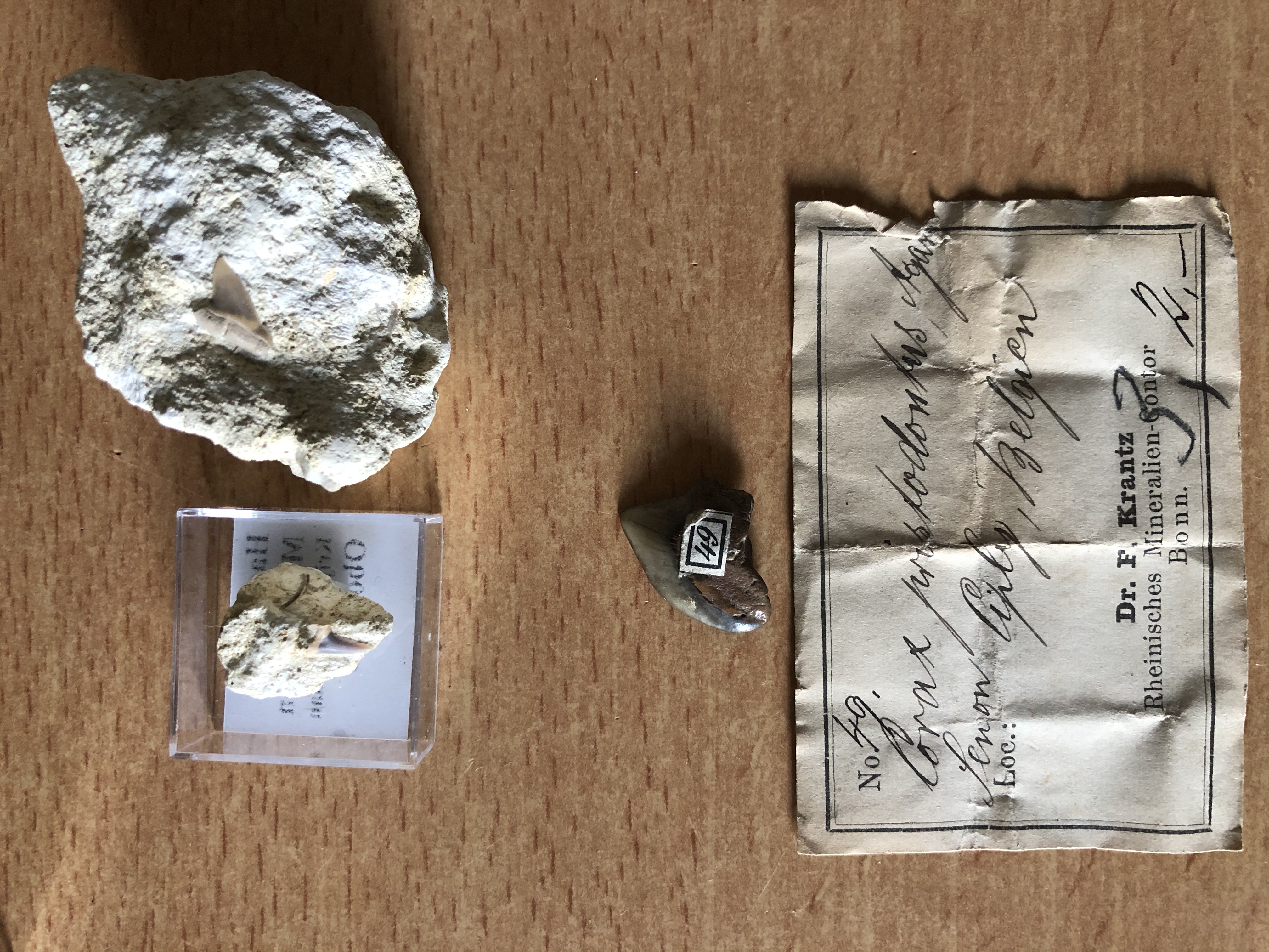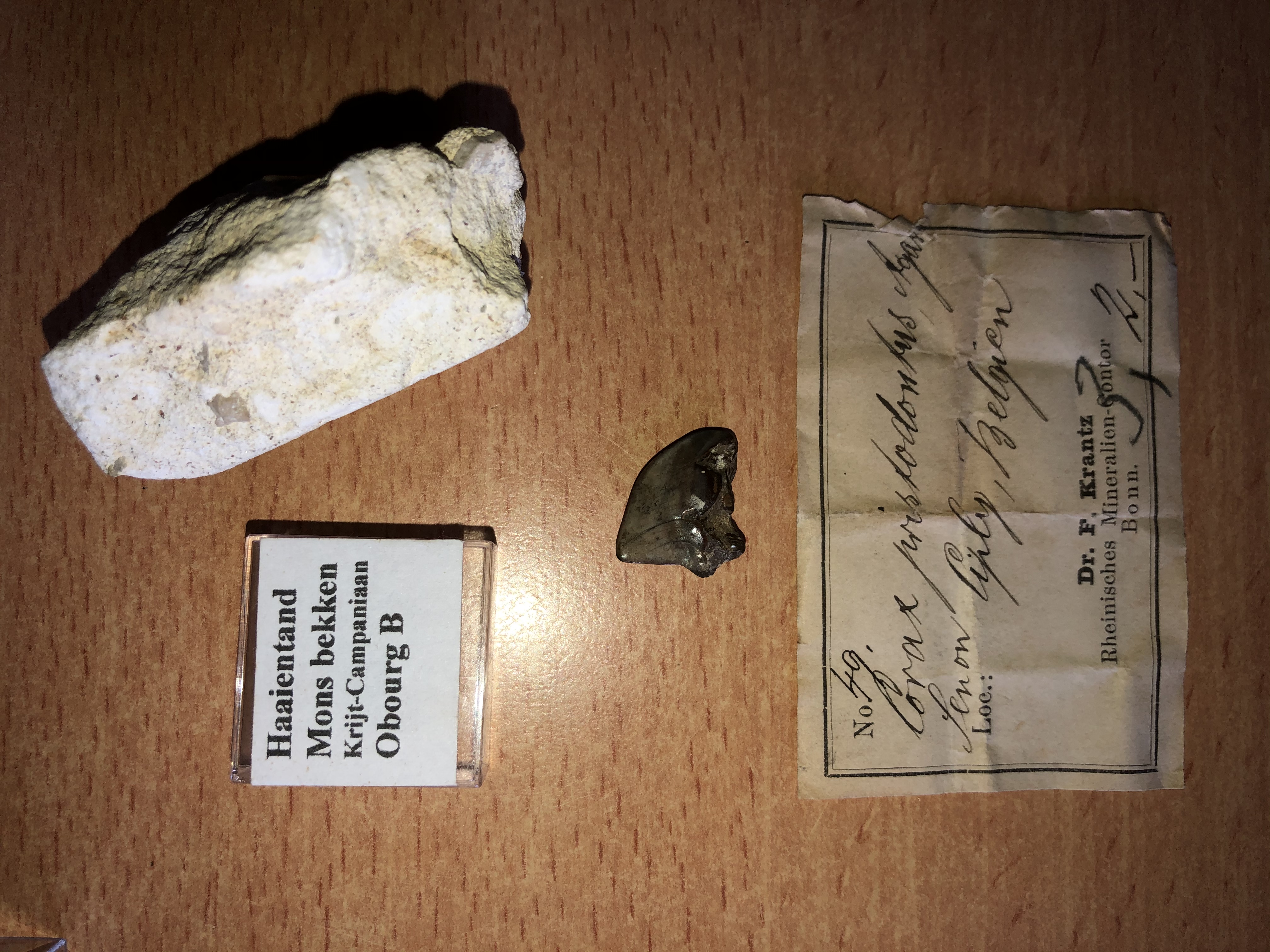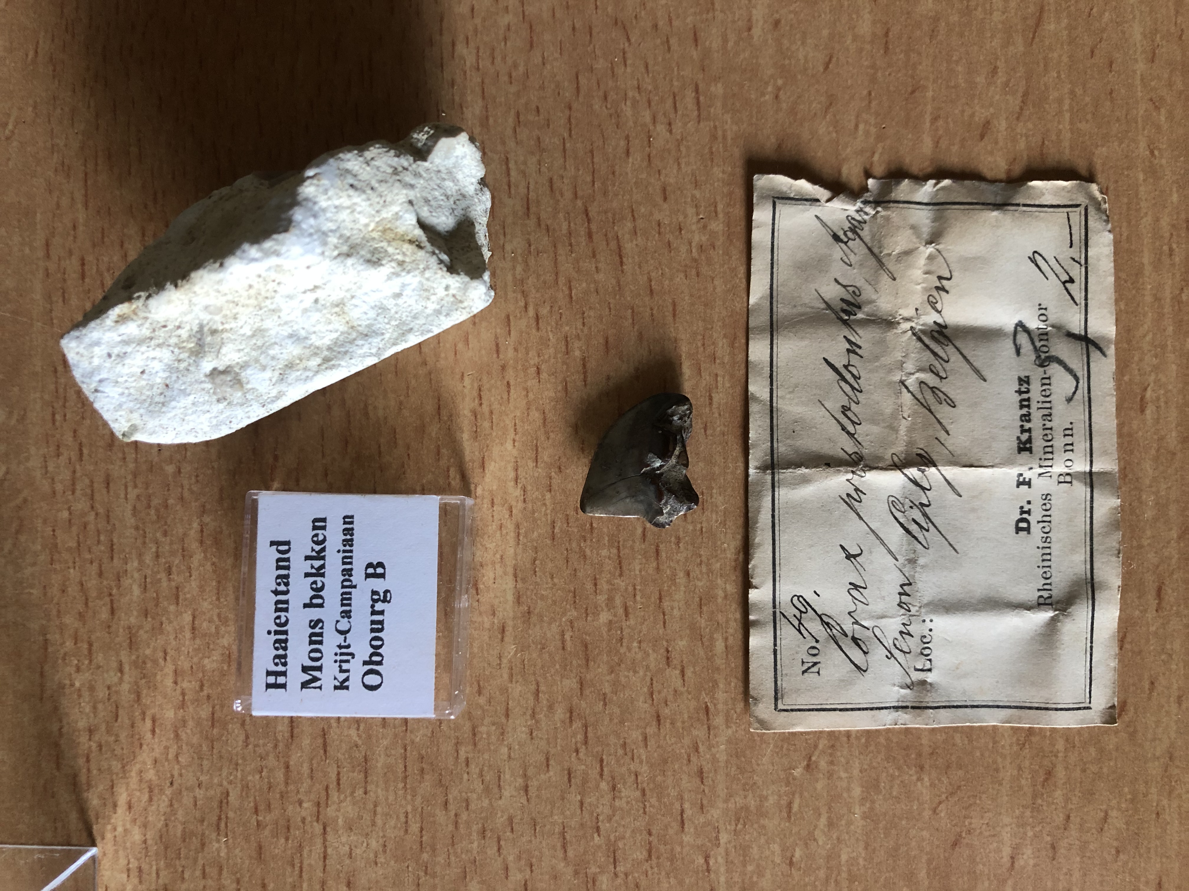 Aangezien ik zo’n beetje al mijn Liège-Maastricht-Aachen area materiaal heb laten zien, wilde ik ook even mijn verdere Belgische Krijt materiaal de revue laten passeren. Wellicht dat jullie hier ook wat ervaring mee hebben. Het gaat om drie tanden. Links boven een tandje uit Obourg. Het probleem met dit tandje is dat ik de soort niet echt kan identificeren. Ook de formatie is mij niet bekend, en ik ben de contact gegevens vergeten te vragen aan de verkoper op de laatste paleontica beurs in Ede. Mijn gok is dat het uit de Craie d’Obourg komt. Ik heb geen artikel gevonden met veelvoorkomende haaientanden van deze locatie. Wellicht dat iemand hier dat wel heeft? En wellicht herkent iemand het labeltje, de man had een stuk of 50 van dit soort doosjes te koop.