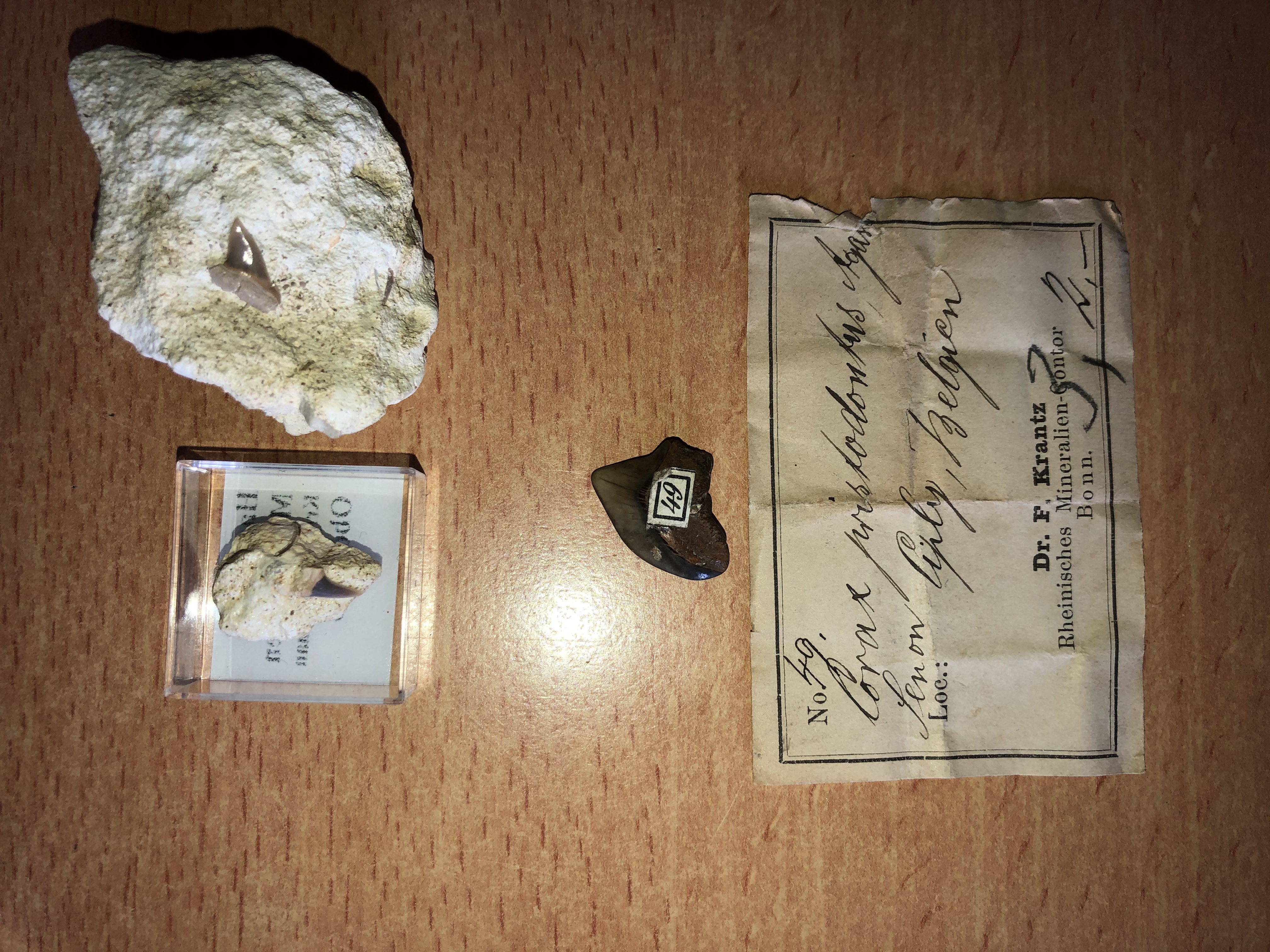 Aangezien ik zo’n beetje al mijn Liège-Maastricht-Aachen area materiaal heb laten zien, wilde ik ook even mijn verdere Belgische Krijt materiaal de revue laten passeren. Wellicht dat jullie hier ook wat ervaring mee hebben. Het gaat om drie tanden. Links boven een tandje uit Obourg. Het probleem met dit tandje is dat ik de soort niet echt kan identificeren. Ook de formatie is mij niet bekend, en ik ben de contact gegevens vergeten te vragen aan de verkoper op de laatste paleontica beurs in Ede. Mijn gok is dat het uit de Craie d’Obourg komt. Ik heb geen artikel gevonden met veelvoorkomende haaientanden van deze locatie. Wellicht dat iemand hier dat wel heeft? En wellicht herkent iemand het labeltje, de man had een stuk of 50 van dit soort doosjes te koop.