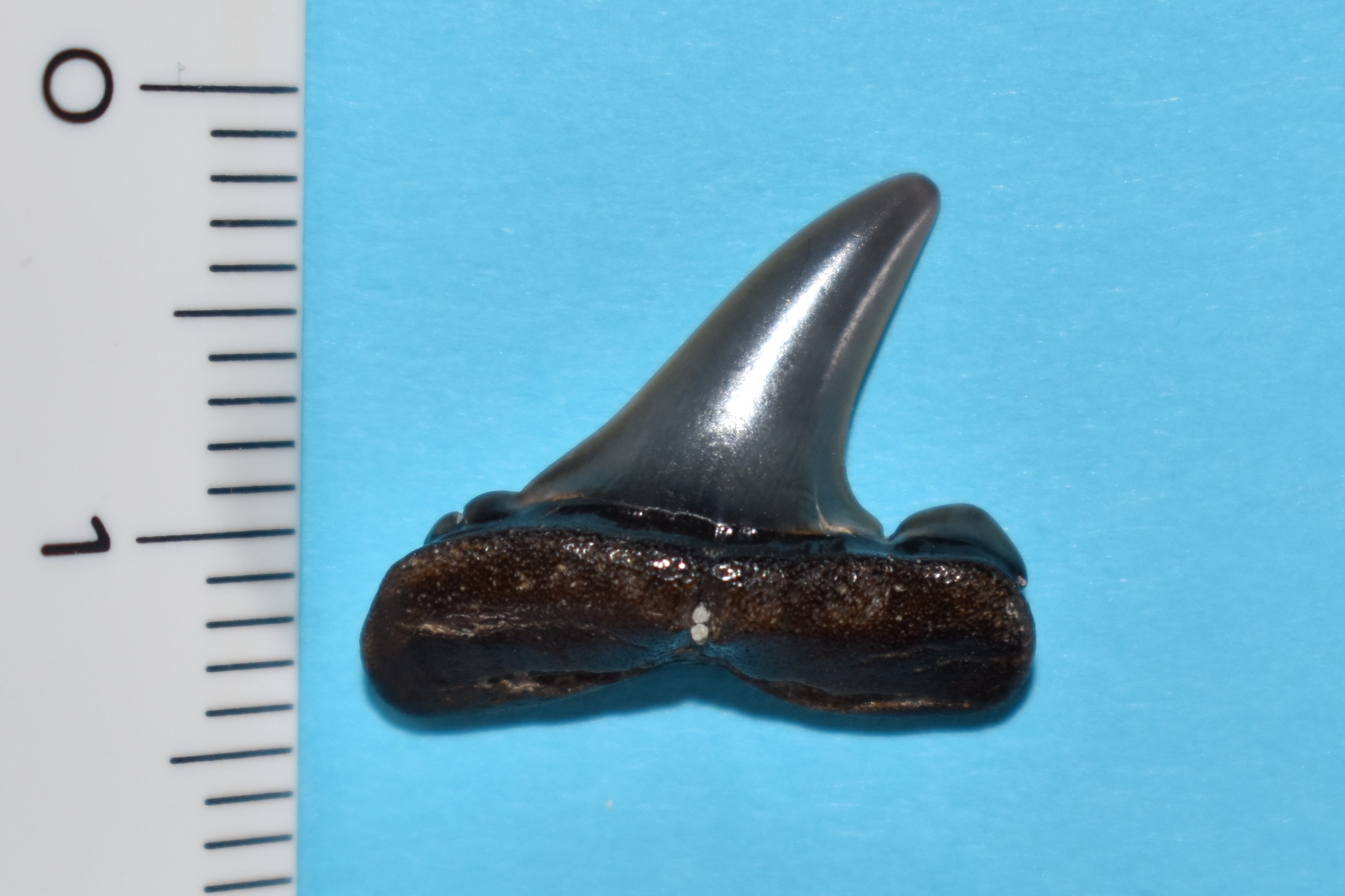Ik dacht in eerste instantie ook dat dit een Jaekelotodus robustus was. Eindelijk nog eens een tandje gevonden in Knokke met langs beide zijden een relatief goed bewaarde fijne bijspits. Deze zou ik hier zeker op het determinatiesysteem plaatsen. Dus snel het tandje gaan fotograferen. Maar toen ik mijn eigen foto van de platte zijde bekeek, merkte ik op dat de bijspitsen afzonderlijk van de kroon staan. Op de platte zijde zie je ook (ongeveer onderaan op de kroon) de twee snijranden van de kroon te voorschijn komen. Hierdoor heb ik het idee van Jaekelotodus robustus geschrapt.