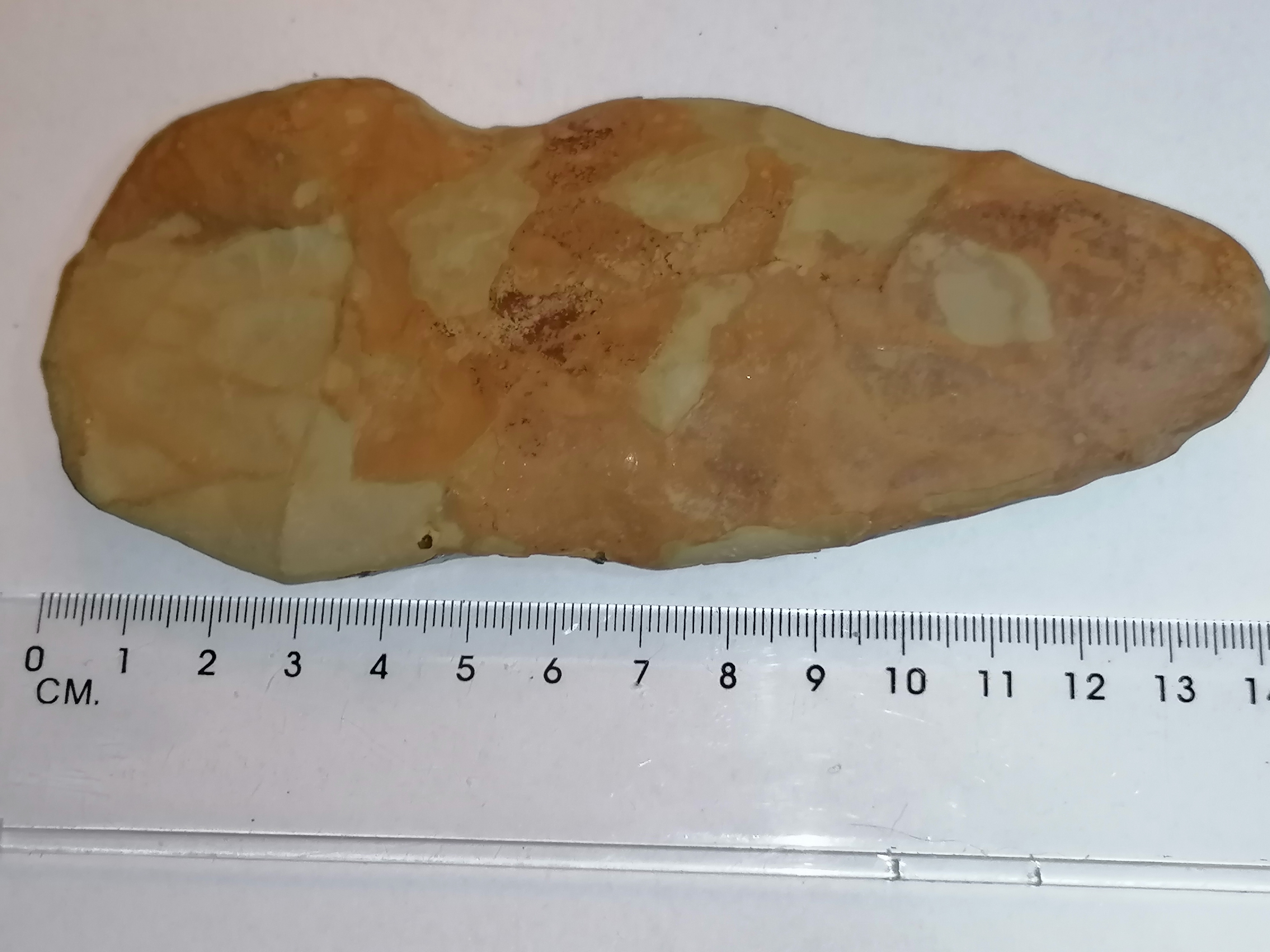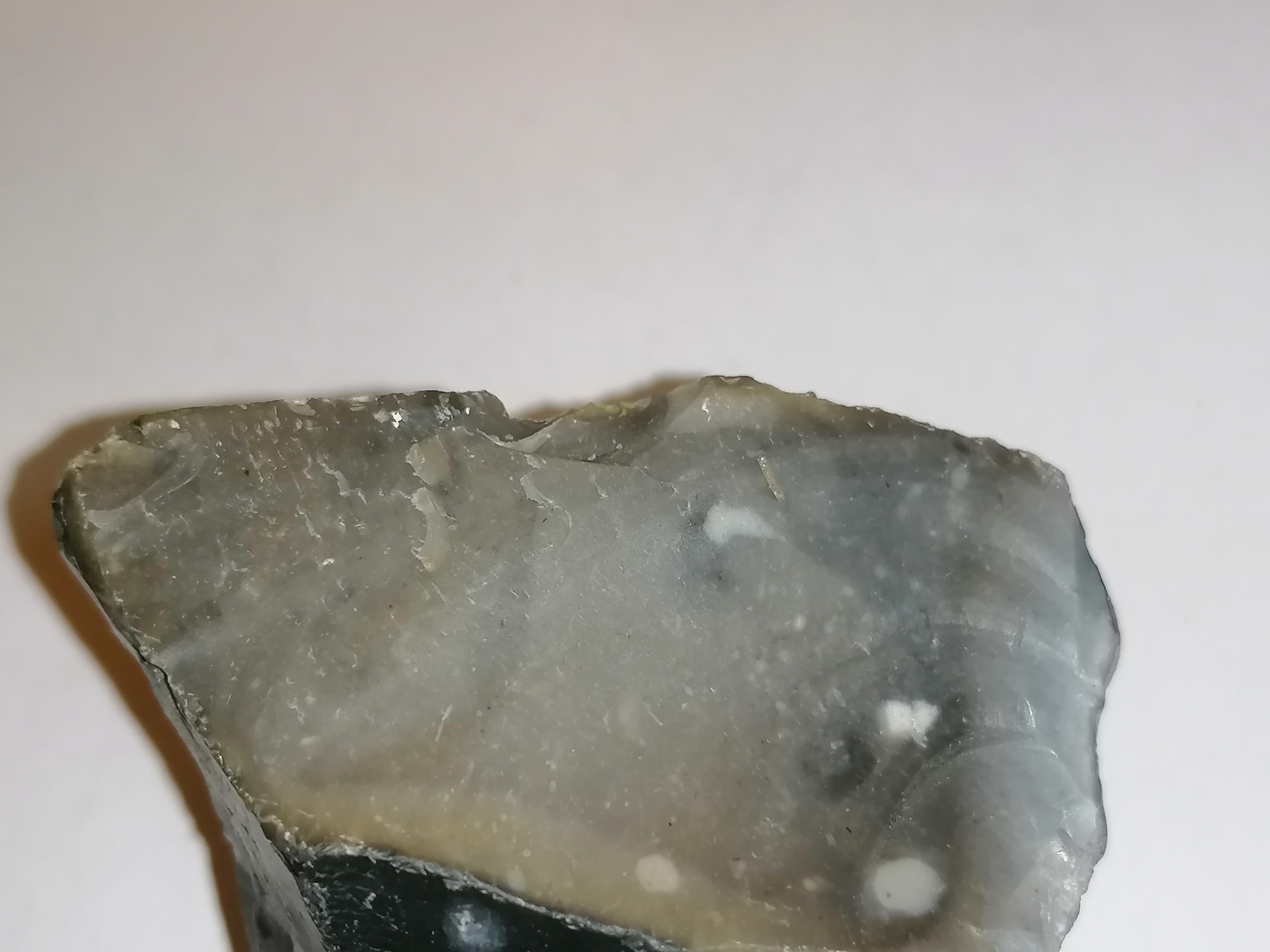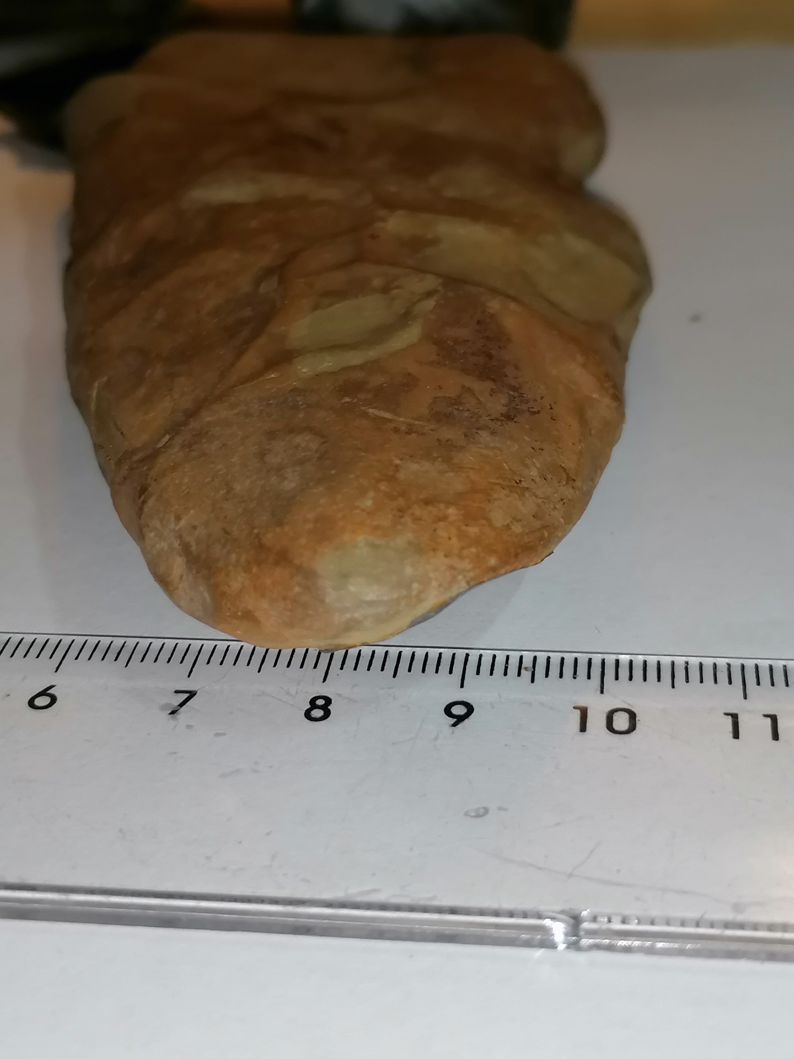 Het stuk waar ik nog het meeste in zie, is het stuk op foto 9, omdat daar de afslag opvallend recht en consistent is, en daarbij aan de andere kant van de hoek ook een soortgelijke afslag weggehaald lijkt te zijn. Het lijkt me zeer onwaarschijnlijk dat dit natuurlijk zo zou zijn ontstaan. Dat gezegd hebbende is de bovenkant van de steen (links), dat wat het afbouwvlak zou moeten zijn, erg onregelmatig. Omdat het er wel op lijkt dat een stuk in elk geval glad en recht is, kan het nog steeds wel een afbouwvlak zijn, met breuk waar de tweetal klingen vanaf geslagen lijken te zijn. Maar ook de breuk is niet een zoals je die bij bewerken zou verwachten. Desondanks mogelijk wel de moeite waard om dit stuk eens aan een specialist te laten zien.