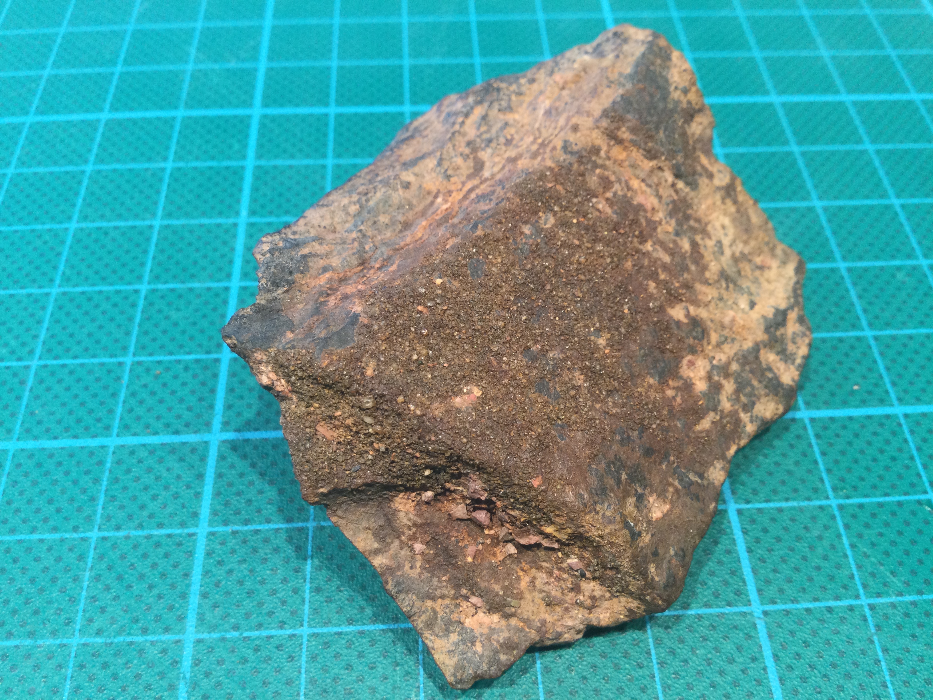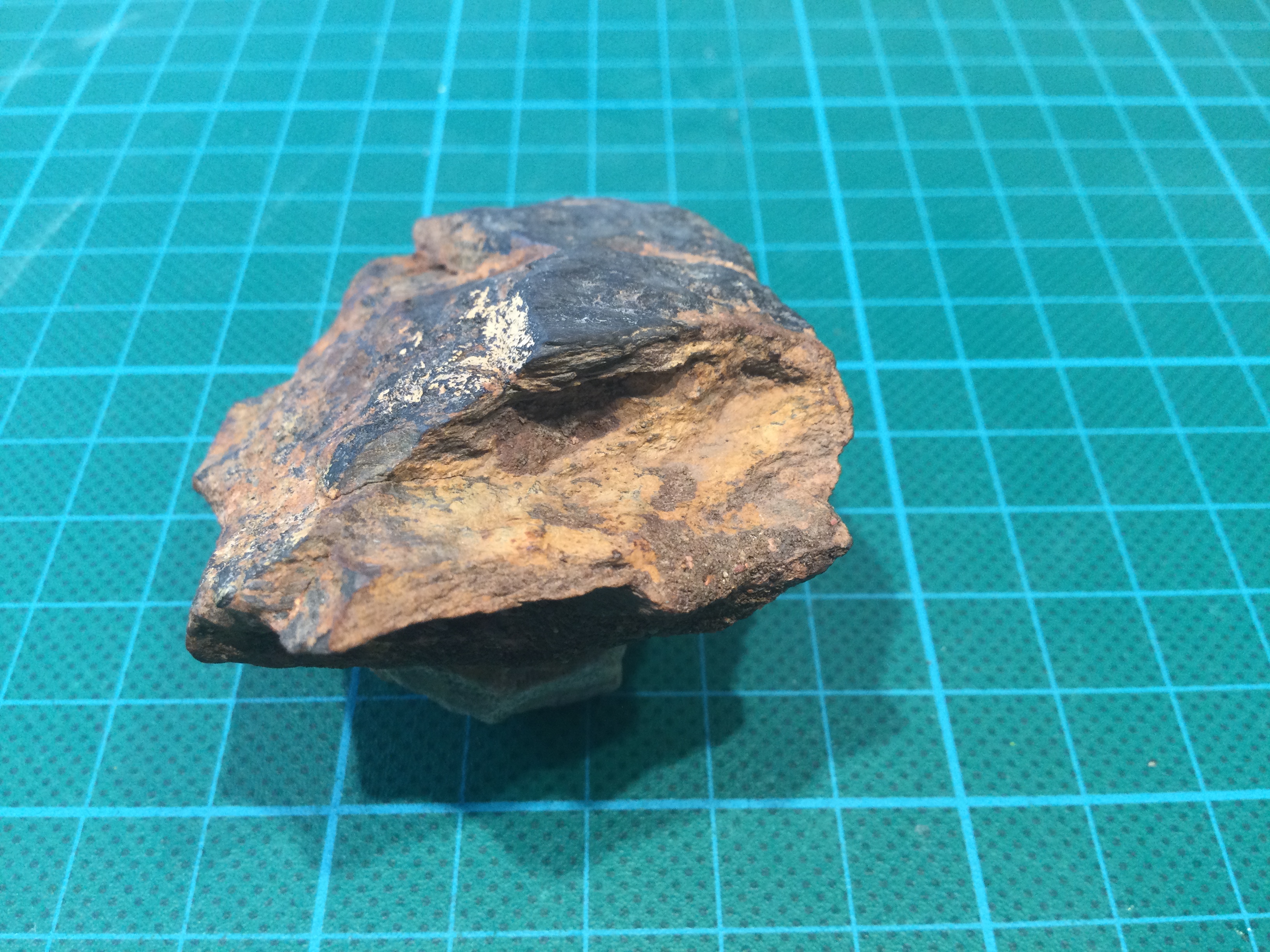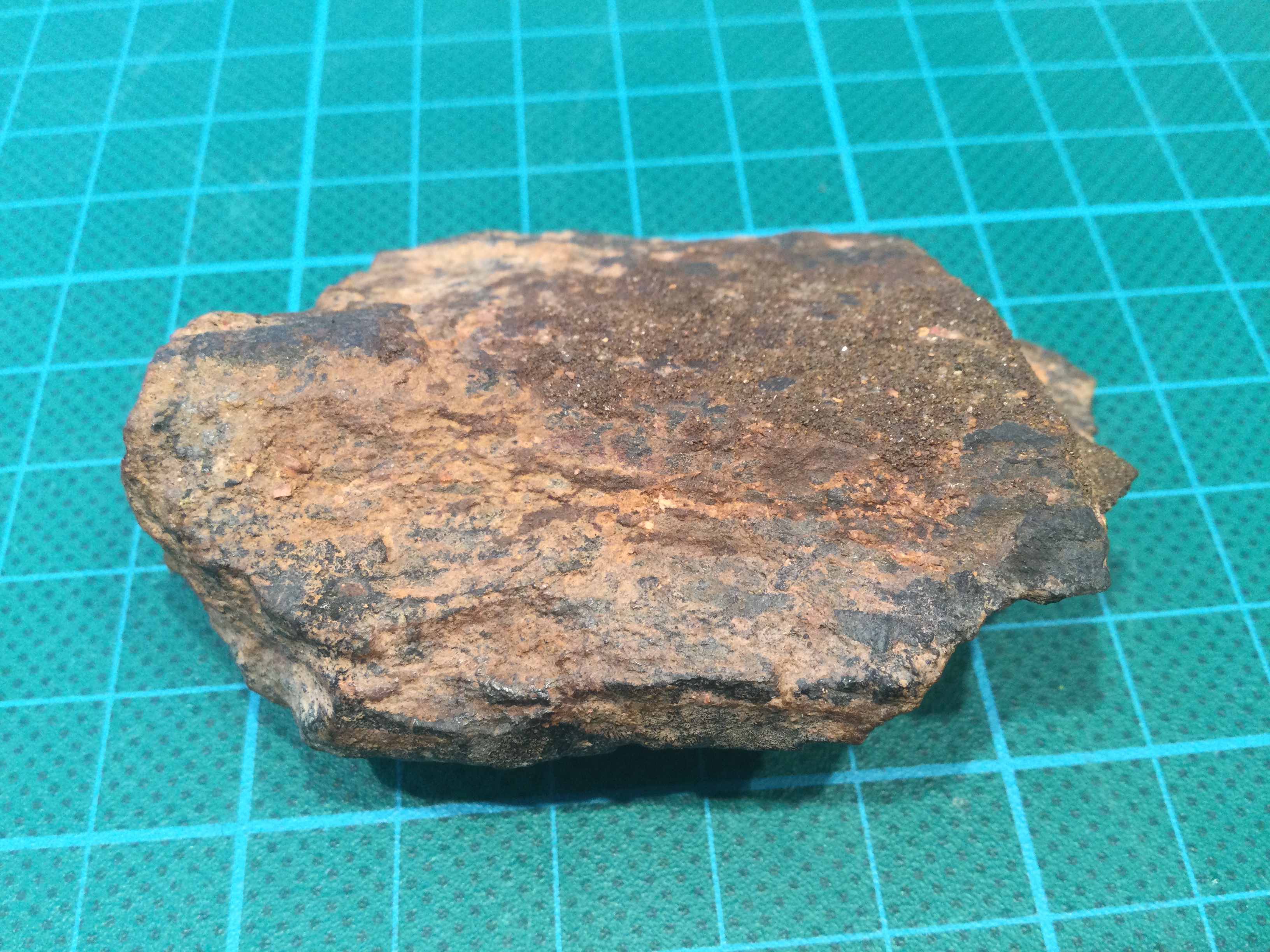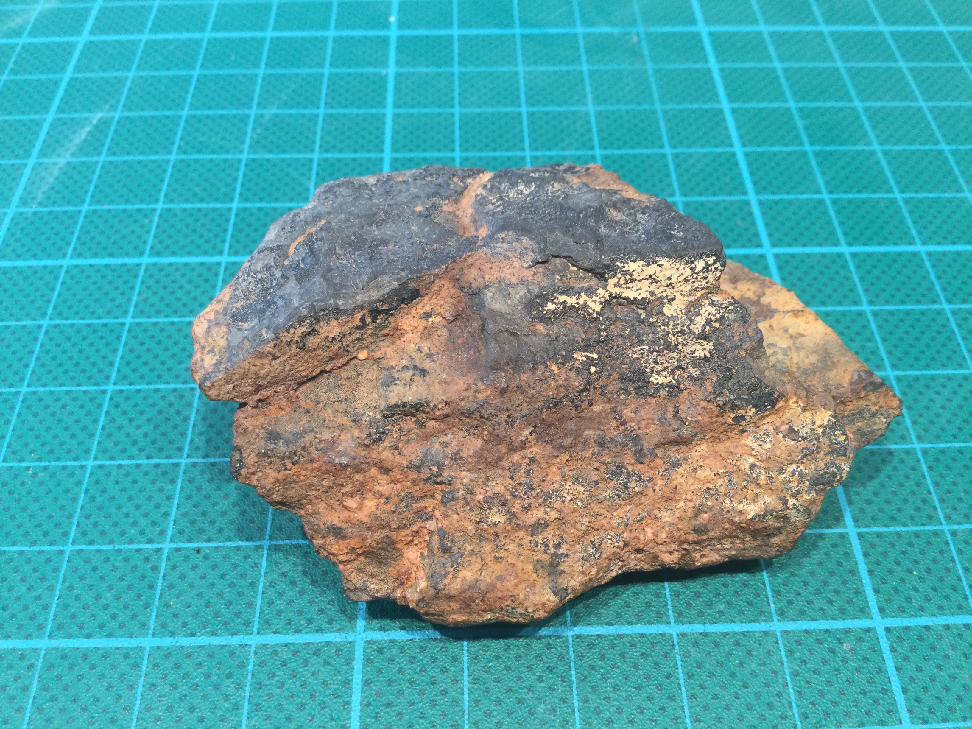 Dan denk ik hier dat het limonietzandsteen zou kunnen zijn? De afbeeldingen die ik vind zien er ook zo uit, met een zwarte korst. Wat denk jij?