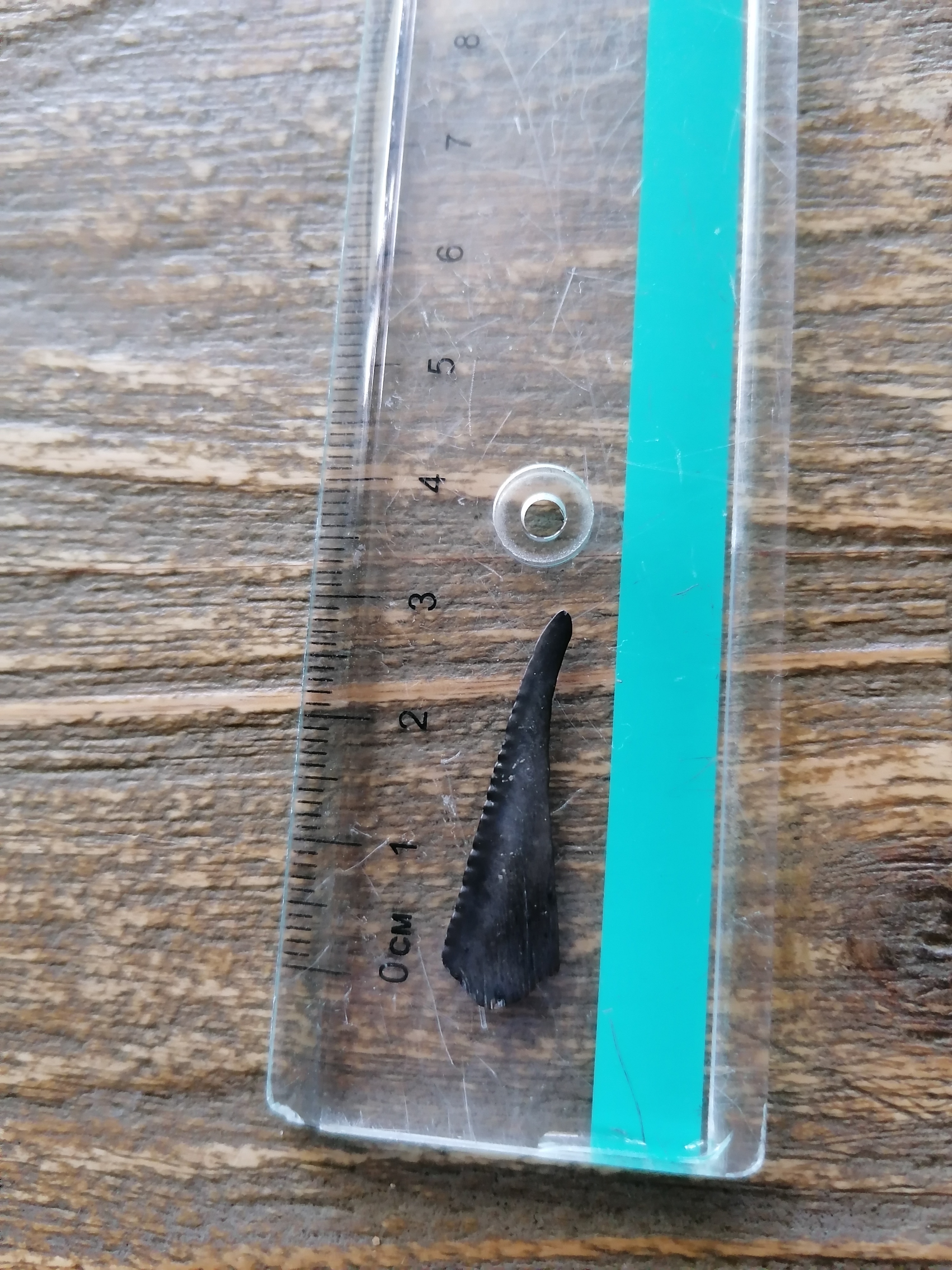 Stuk glazuur haaientand met kartels; mijn eerste zelfgevonden great white of megalodon?