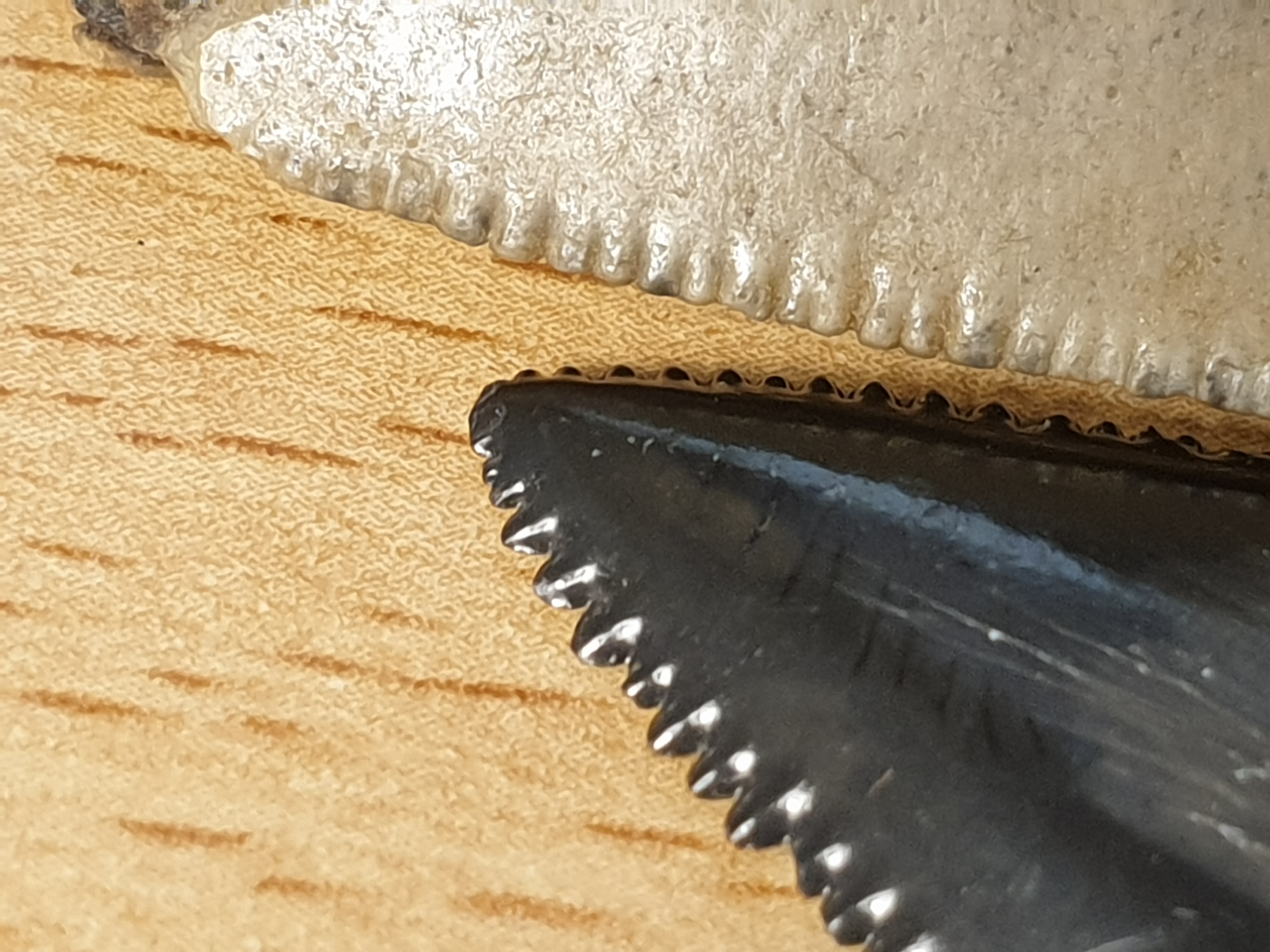Ik ben ook helemaal geen specialist wat betreft de haaientanden, eerder een leek vergeleken met de rest hier. Maar heb wel het geluk dat ik in Zeeland een behoorlijk aantal Megalodon en Carcharias tanden heb gevonden. Het kan natuurlijk door de afrolling komen, maar de Megalodon tanden lijken hier toch iets fijnere en minder uitgesproken kartels te hebben. Ik zal als voorbeeld een foto meesturen.