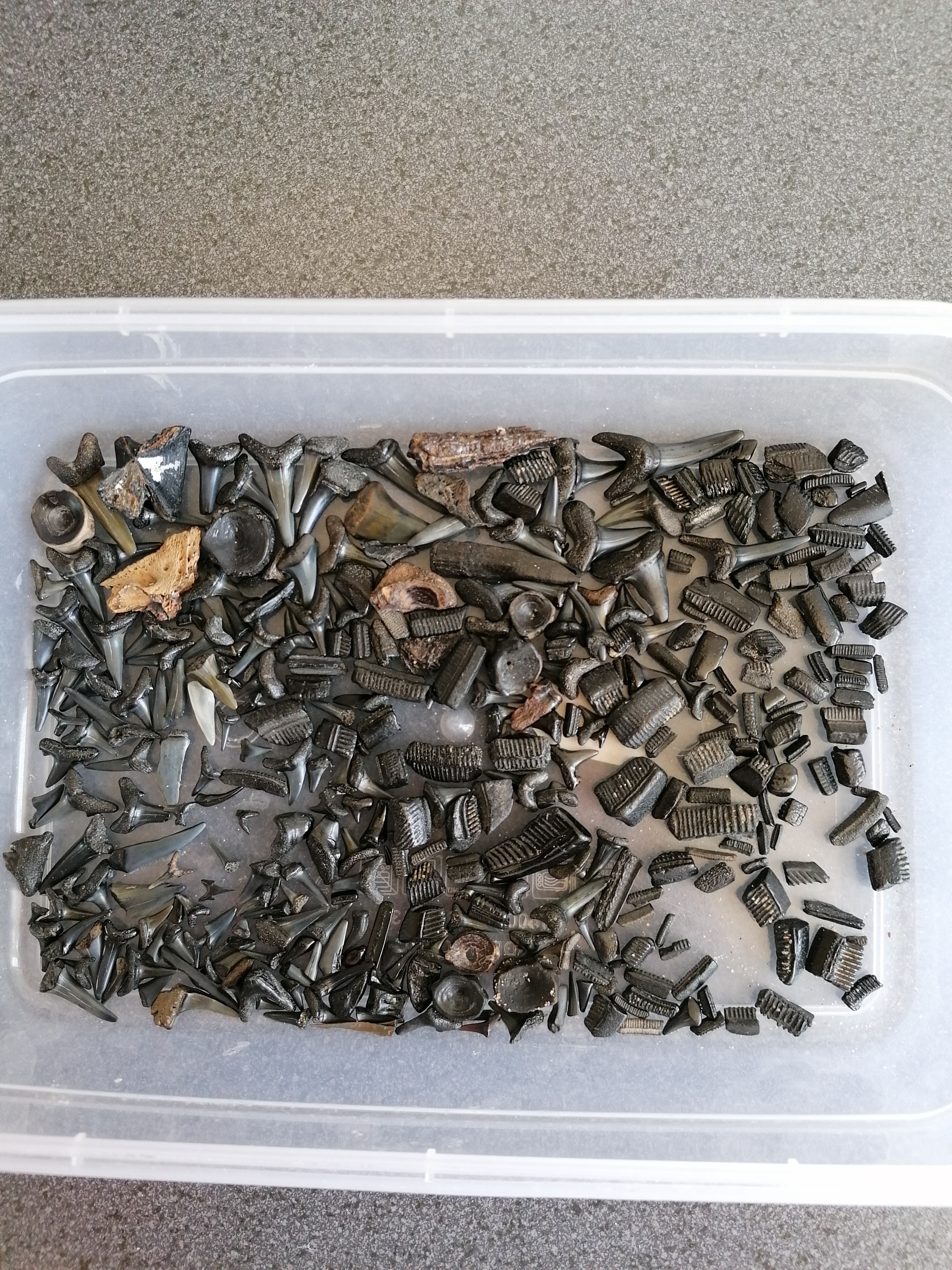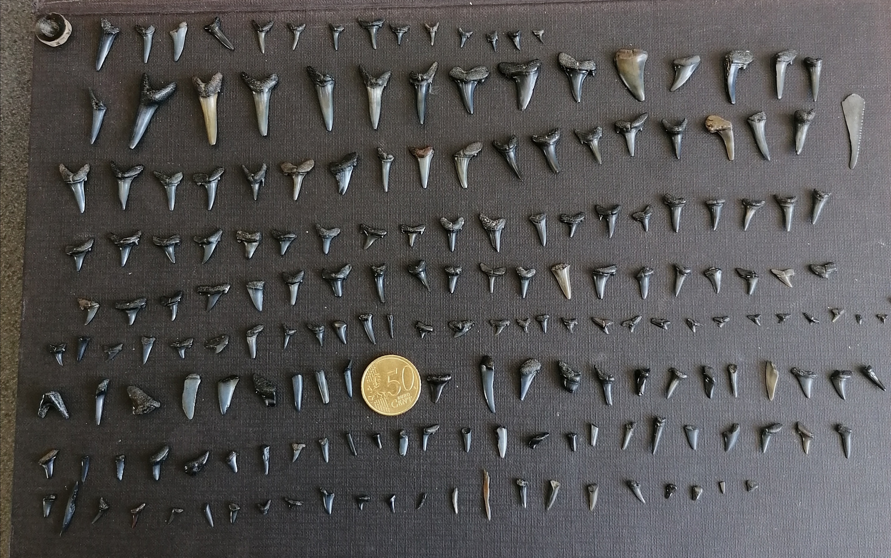 Vanmiddag ben ik thuis aangekomen en heb de haaientanden nog netjes op een rijtje gelegd en getelt. Ik kwam uit op zo'n 186 haaientanden, daarna heb ik ze nog netjes gefotografeert.