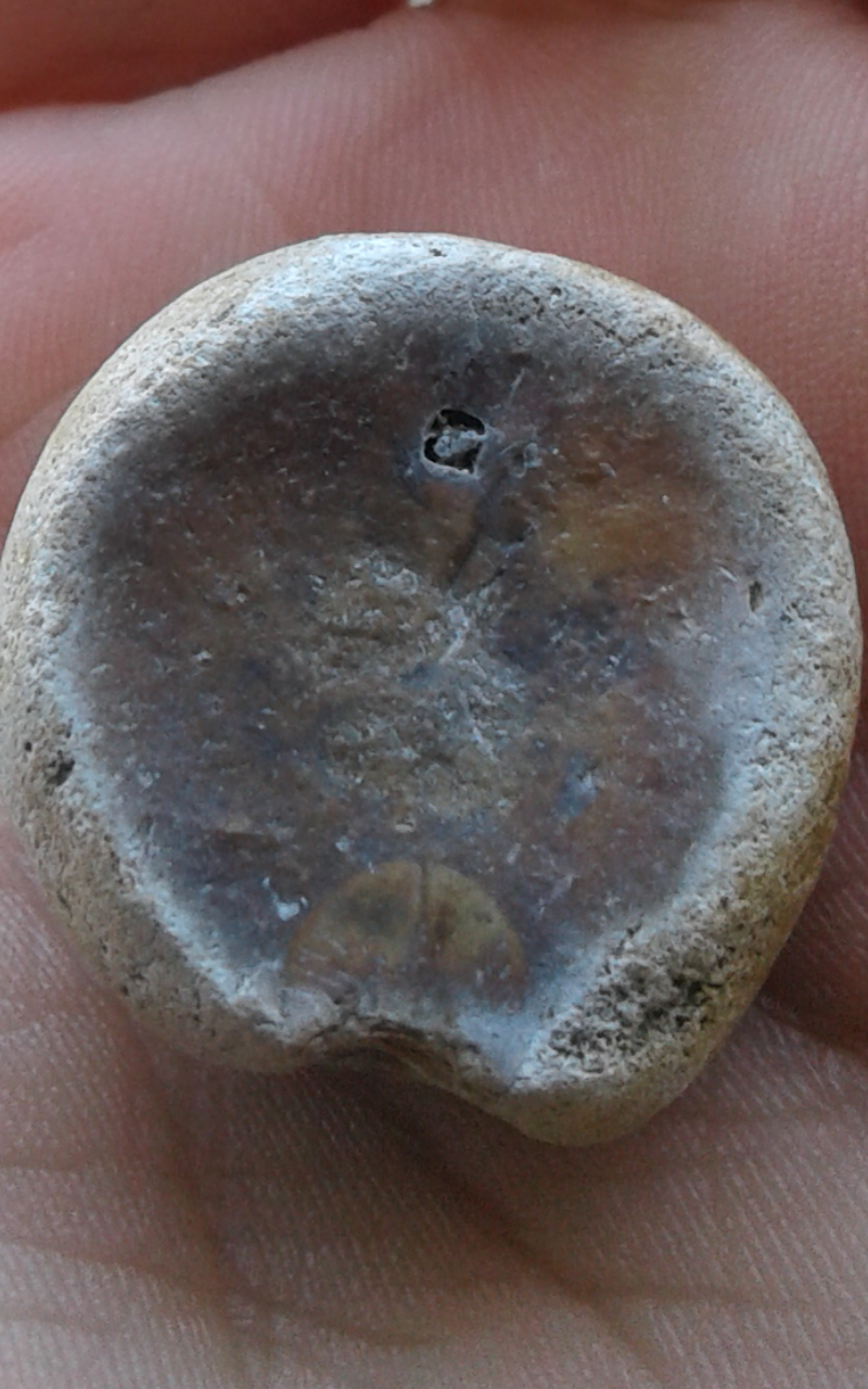 Het zal niet de eerste keer zijn dat we gefopt worden door vreemd gevormde vuurstenen met breukvlakken. Mijn analyse: deze ooit rond afgesleten vuursteen met gat heeft voorheen een flinke opdonder gehad (waarschijnlijk in een rivier) waardoor er een stuk is afgeslagen => glasachtige breuk met cirkelpatronen. Vervolgens is de steen opnieuw langere tijd door de rivier afgesleten waardoor de scherpe randen van de eerdere breuk weer afgerond zijn maar het breukvlak, dat net wat dieper ligt, is gespaard gebleven van slijtage.
