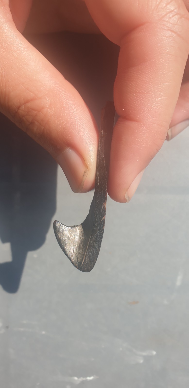 foto's zijn wel wat donker, bij been artefacten zie je zga altijd menselijke bewerking zoals schuurlijntjes enz vaak ook op de andere vlakken, het haakje lijkt bewust gemaakt, maar als ik zo naar alle foto's kijk zie ik er meer een botfragment van een pijpbeen in. Maar wellicht kun je betere foto's plaatsen waarbij je duidelijk kunt zien dat de vorm bewust is gemaakt?