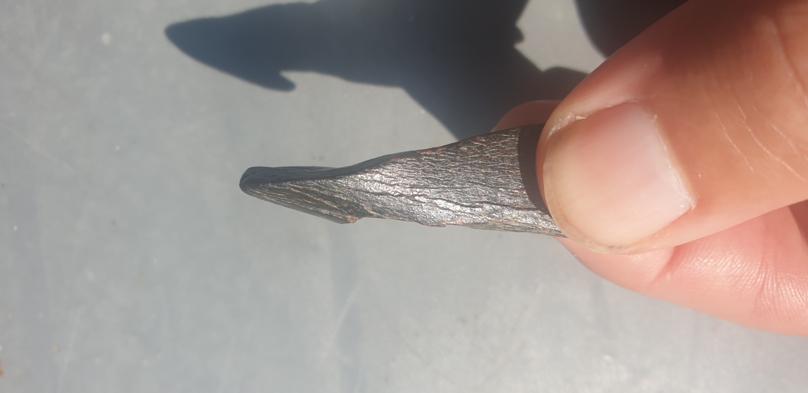 Mooie foto’s! Hoewel ik de gedachte goed begrijp gelet op de eerste foto’s, ben ik op basis van de laatste foto’s van mening dat sprake is van een natuurlijke breuk. Wat jij het “snijlijntje” noemt lijkt mij juist waar het bot uit elkaar is gebroken. Vooral op de drie na laatste foto zie je een schilverachtige breuk. Bewerkingsporen zijn veel strakker. Sowieso heeft deze vorm geen nut als pijlpunt. Zoek maar eens op voorbeelden van spitsen.