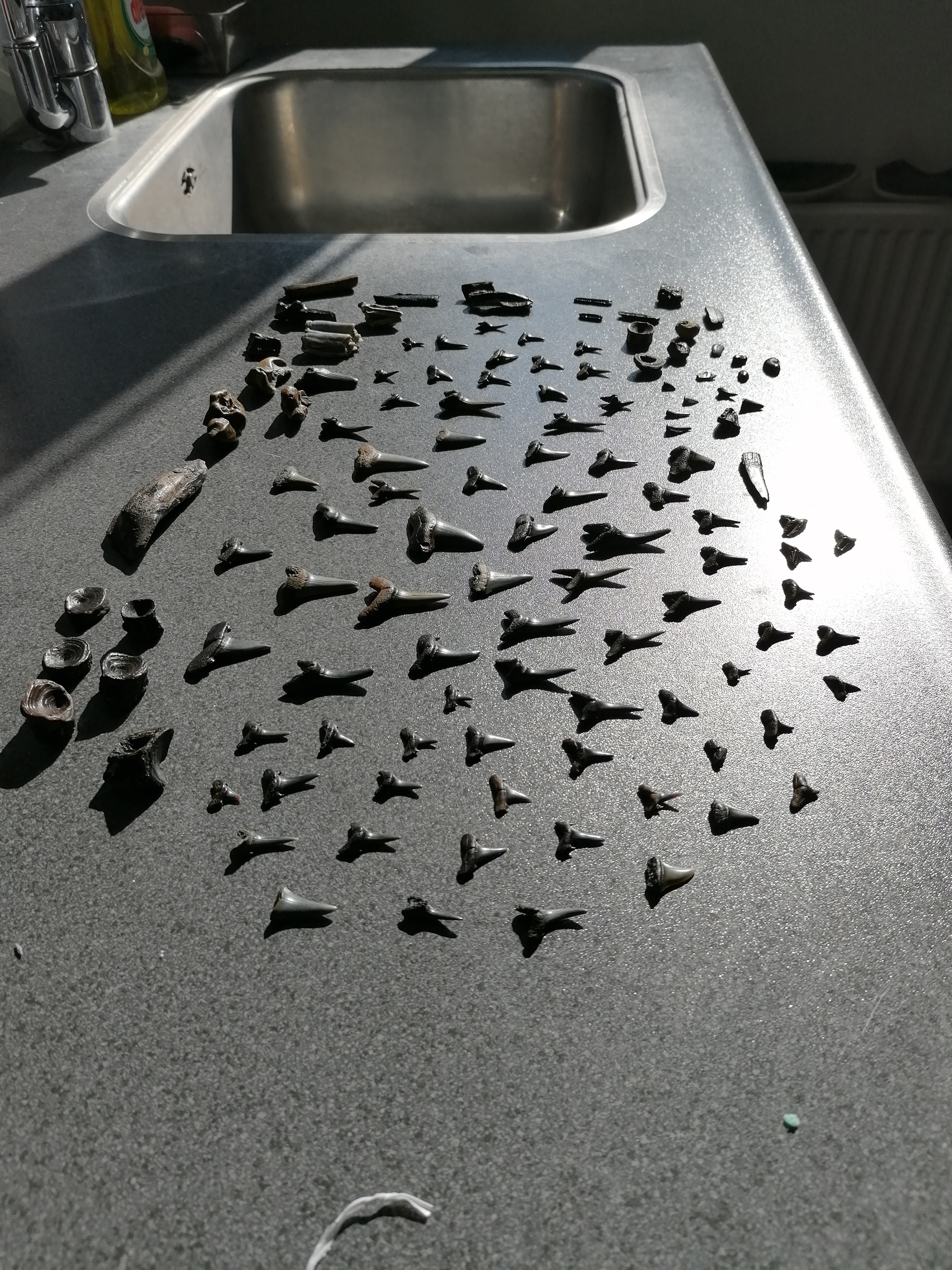 Dit zijn een paar van mijn topstukken van de zeeuwse en vlaamse kust (kaloot, zoutelande, zwin knokke en zwin cadzand). Het zijn o.a. Land zoogdier kiezen, vissentanden, land zoogdier botten, periotica's en een bulla van dolfijn-achtigen, vissenwervels, 1 haaienwervel, rostrale tand zaagvis, huidstekels raja clavata, myliobatid staartstekels, gearticuleerde roggentanden myliobatis en aetobatus, haaientanden o.a. Striatolamia macrota, hypotodus verticalis, jaekelotodus robustus, brachycarcharias lerichei, carcharhinus, carcharodon hastalis, odontaspis winkleri, araloselachus cuspidatus, araloselachus reticulatus, otodus auriculatus en carcharias taurus, een vissenkaakje, cleithrum van een schelvis-achtige en een tand van de tetraodontiforme teleost eotrigonodon serratus. Ik hoop dat jullie ze even mooi vinden als ik!
