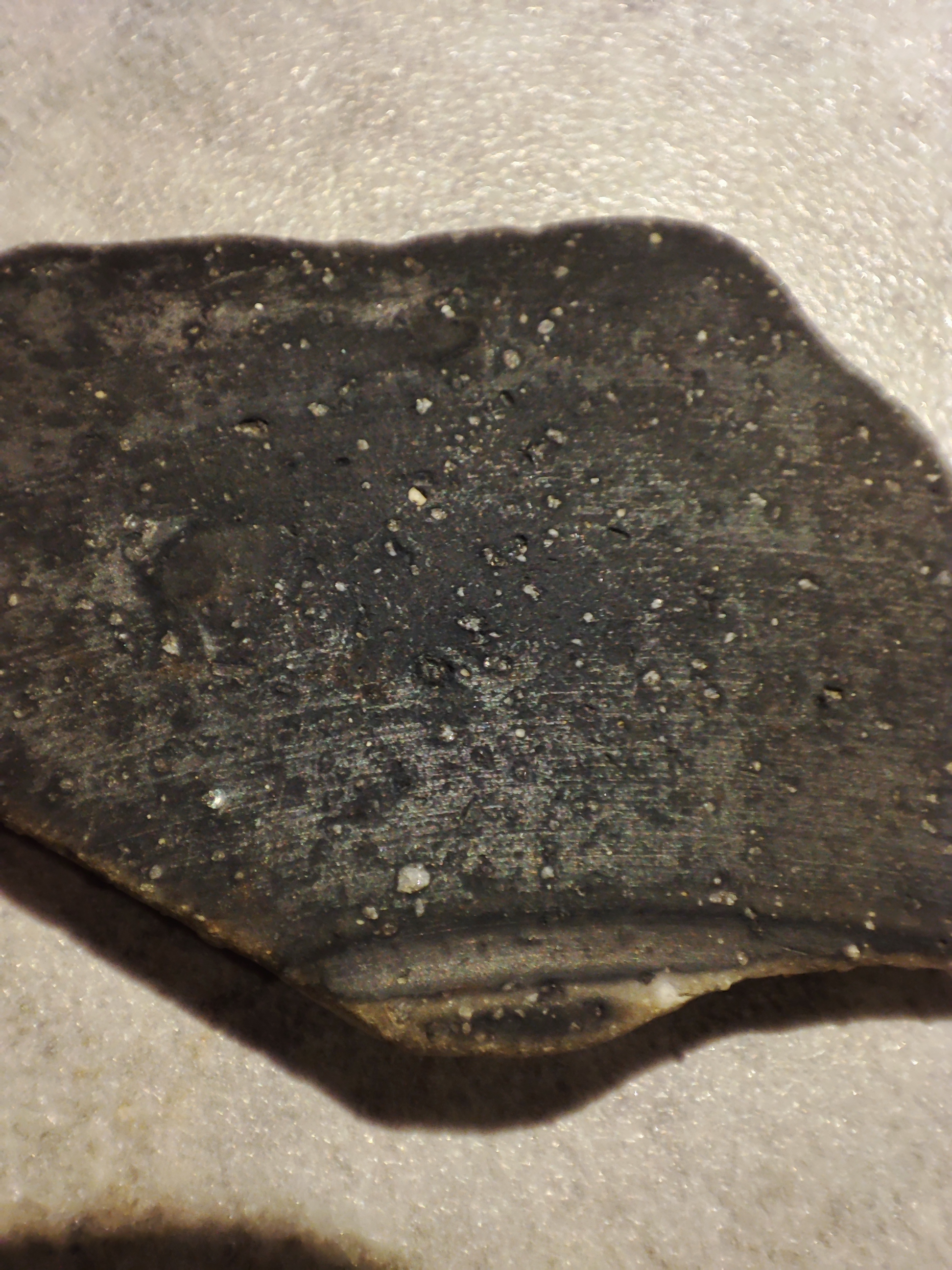 het lijkt mij een aardewerk scherf. Het is een scherf van een op een draaischijf gedraaide pot(zie de ribbels). lijkt mij 14e 15e eeuw. Het is verschraald met grof zand dat je ziet zitten.