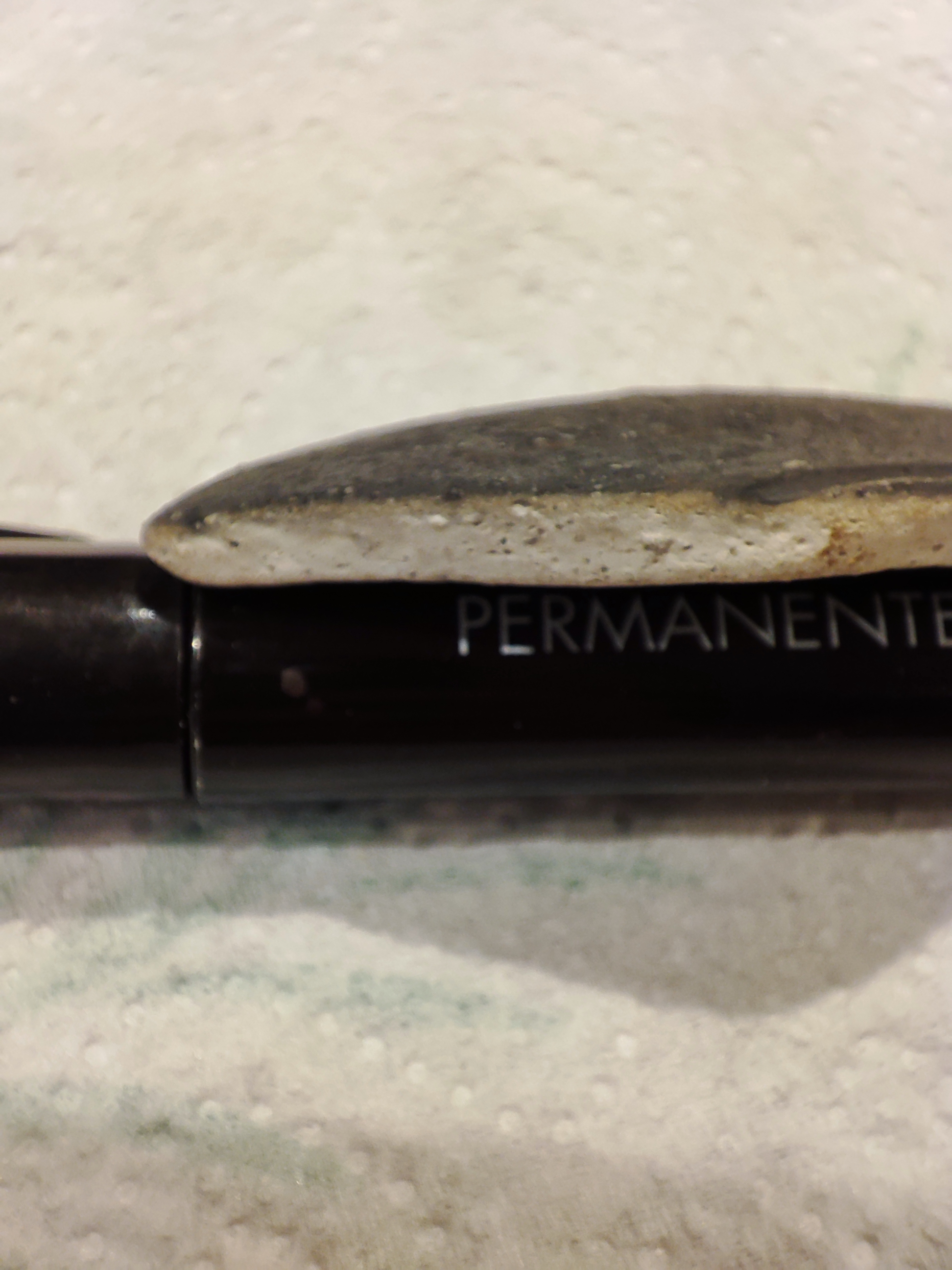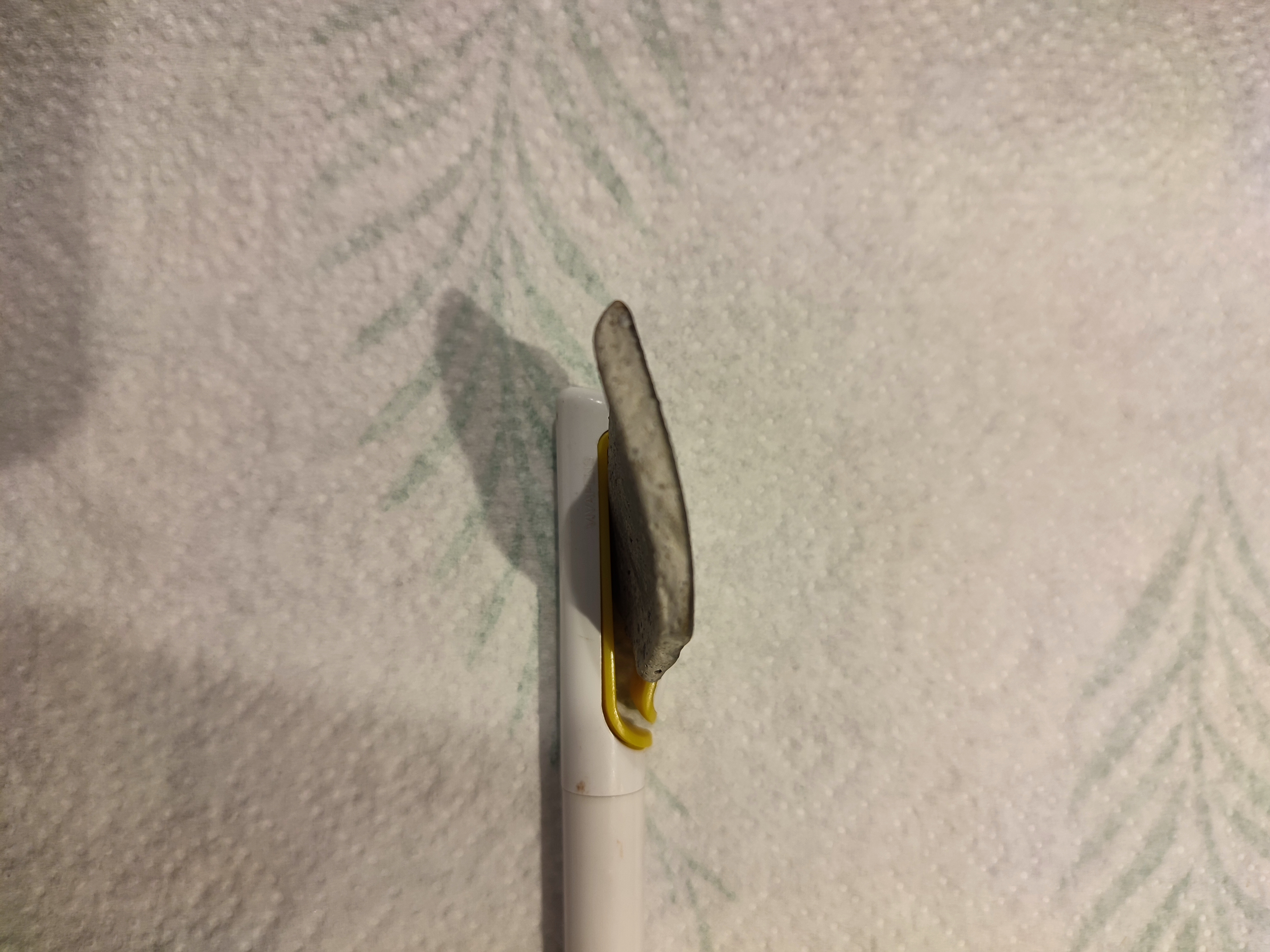 Ben nieuw hier ,mijn dochter van 9 had op tv gezien dat mensen fossielen zochten langs het strand en wou dat ook graag doen .zondag waren wij bij Langeveldeslag en vonden wij dit stuk ,er zit een lichte bolling in is ongeveer 4 bij 3cm de zwarte kant is redelijk vlak en een beetje ruw ,onderkant zitten groeven en het is evenredig dik heeft een iets doffere klank dan als je steen op steen doet verder zitten in de zijkant wel wat gaatjes maar niet heel veel.