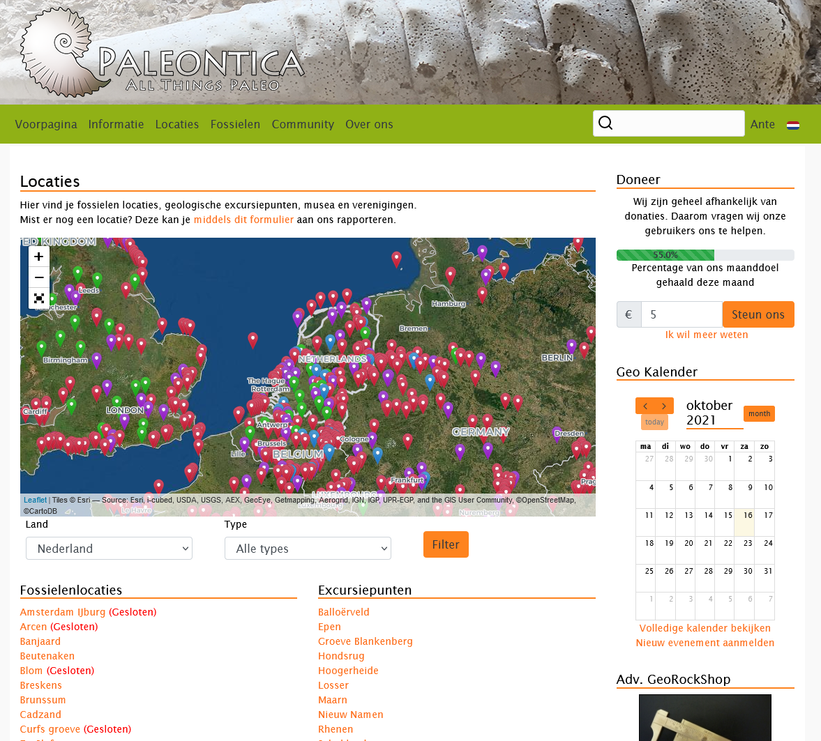 Na de overgang naar de nieuwe versie zal de voorpagina er als volgt uit zien: Ook het zoeken van locaties is wat visueler gemaakt. We hebben een mooie kaart met pinnetjes waarop je kan klikken en daaronder een lijst met alle resultaten gesorteerd op type Het zoeken van fossielen is ook makkelijker gemaakt. Overal over de site zul je zulke dropdown-menutjes vinden die verschijnen als je iets begint te typen. Dit helpt jou de juiste te vinden en ons om de database consistent te houden. Het toevoegen van fossielen werkt net zo. Waarbij eventuele extra velden verschijnen indien ze nodig zijn.