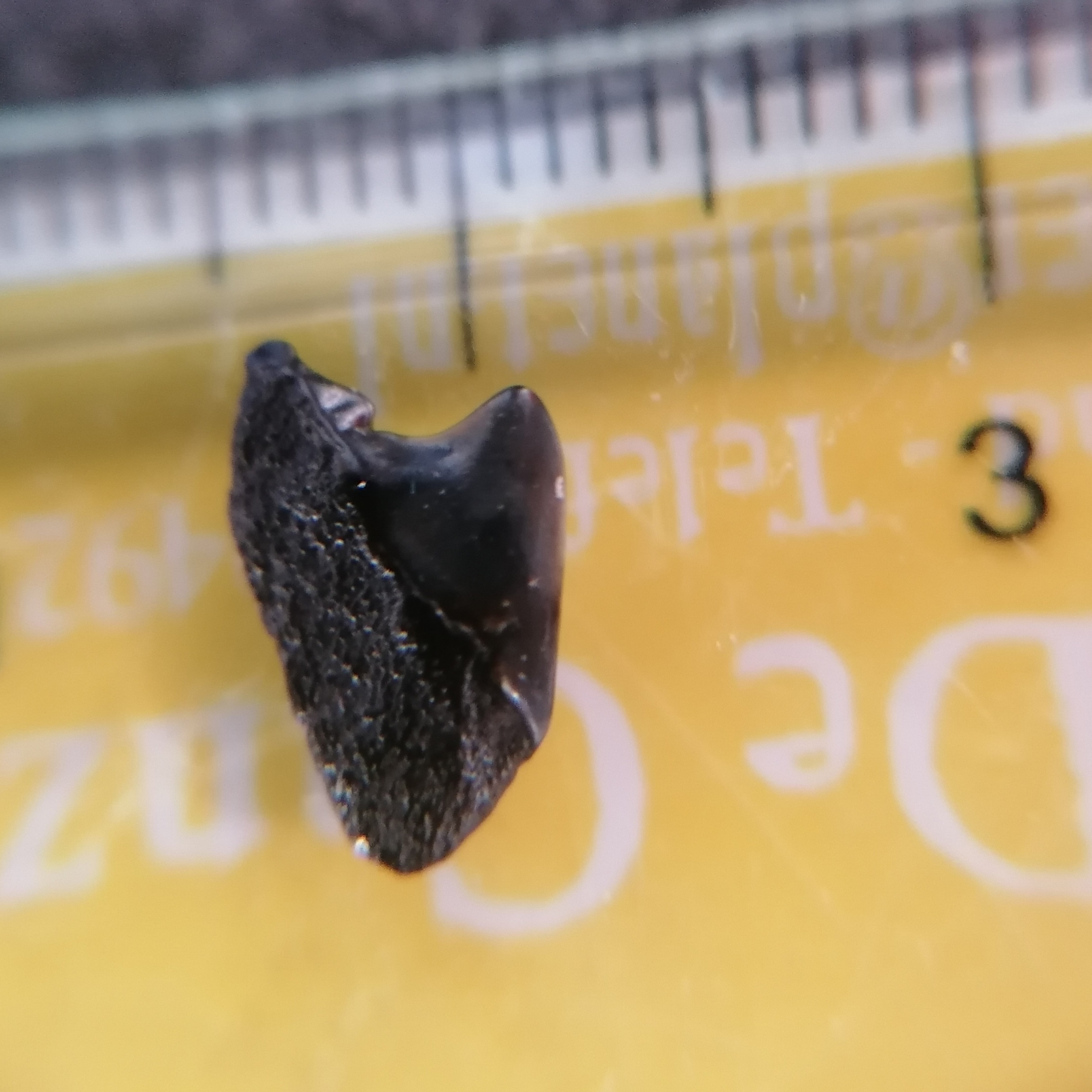 Bij de eerste tand (uit de andere post) zie ik direct dat hij gebroken is, maar bij deze niet. Ik zou graag leren, hoe men kan zien dat dit niet van een Galeocerdo of van een haai uit de familie Carcharhinidae is. Ik vermoed (dus ook hier een vraag) dat bij zo sterk gerolde stukken de karteling kan ontbreken? Ik zelf heb helaas (nog) geen tanden van deze groepen en baseer mijn vraag dus alleen op foto's (o.a. uit Cocke, 2002, Fossil Shark Teeth of the world).