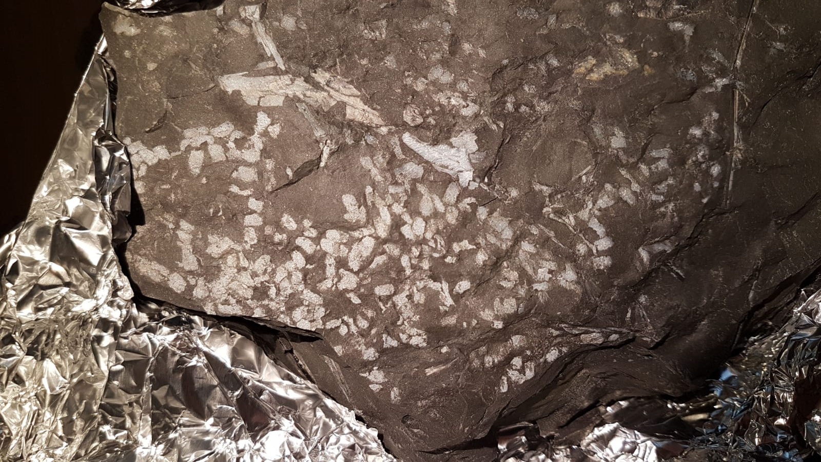 Iemand een idee wat dit kan zijn? Het gaat om een paar millimeter lange 'korrels', in een voor de Piesberg typische illiet-bewaring. Tweede foto toont een opname onder de microscoop, maar heel veel structuur valt er niet te zien helaas... Zou het om kleine coprolietjes of iets dergelijks kunnen gaan?
