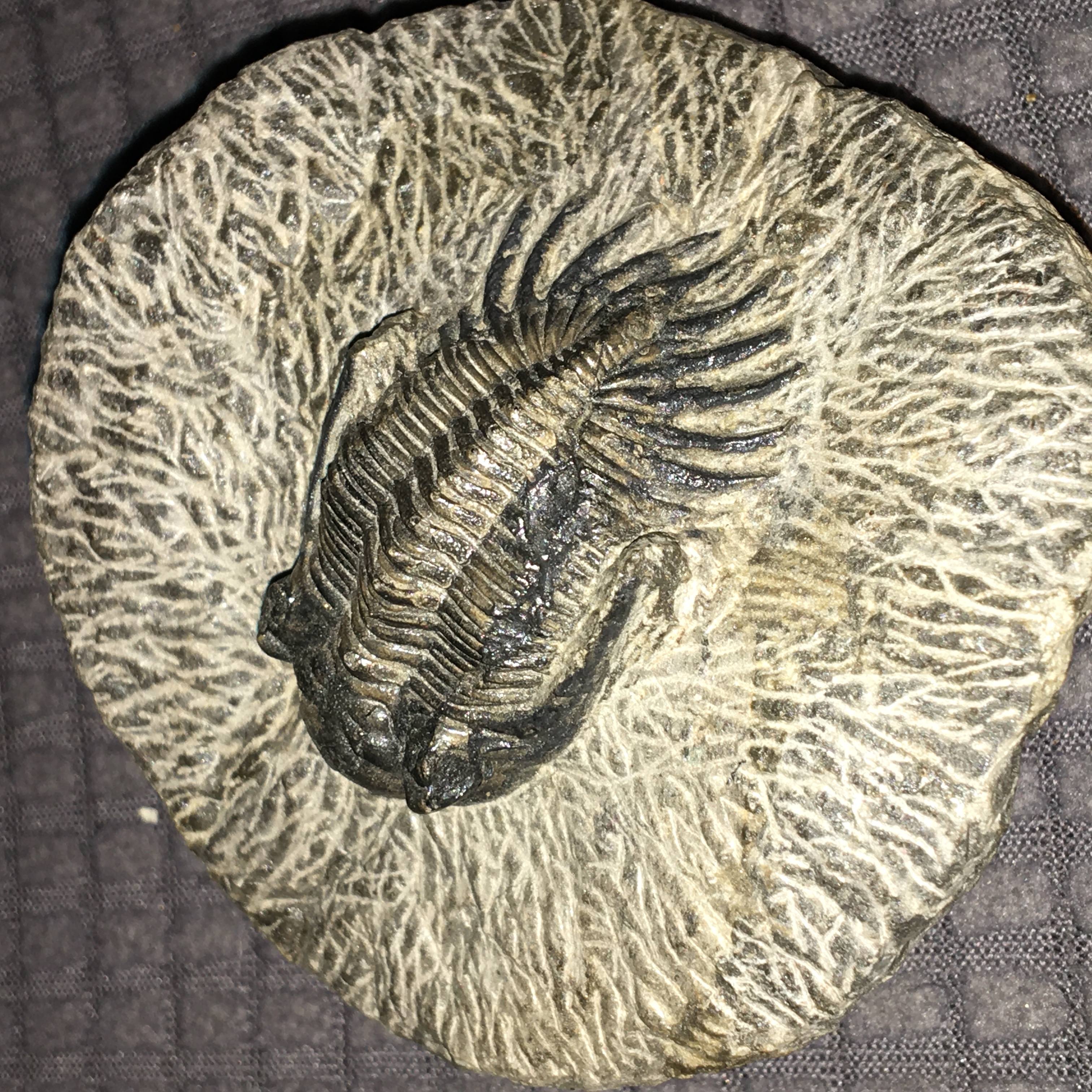 Ik heb deze trilobiet gekocht op de beurs van ACAM afgelopen weekend, maar er stond niet bij welke soort deze is. Zouden jullie kunnen helpen met het identificeren van mijn fossiel, mij lult het niet goed.