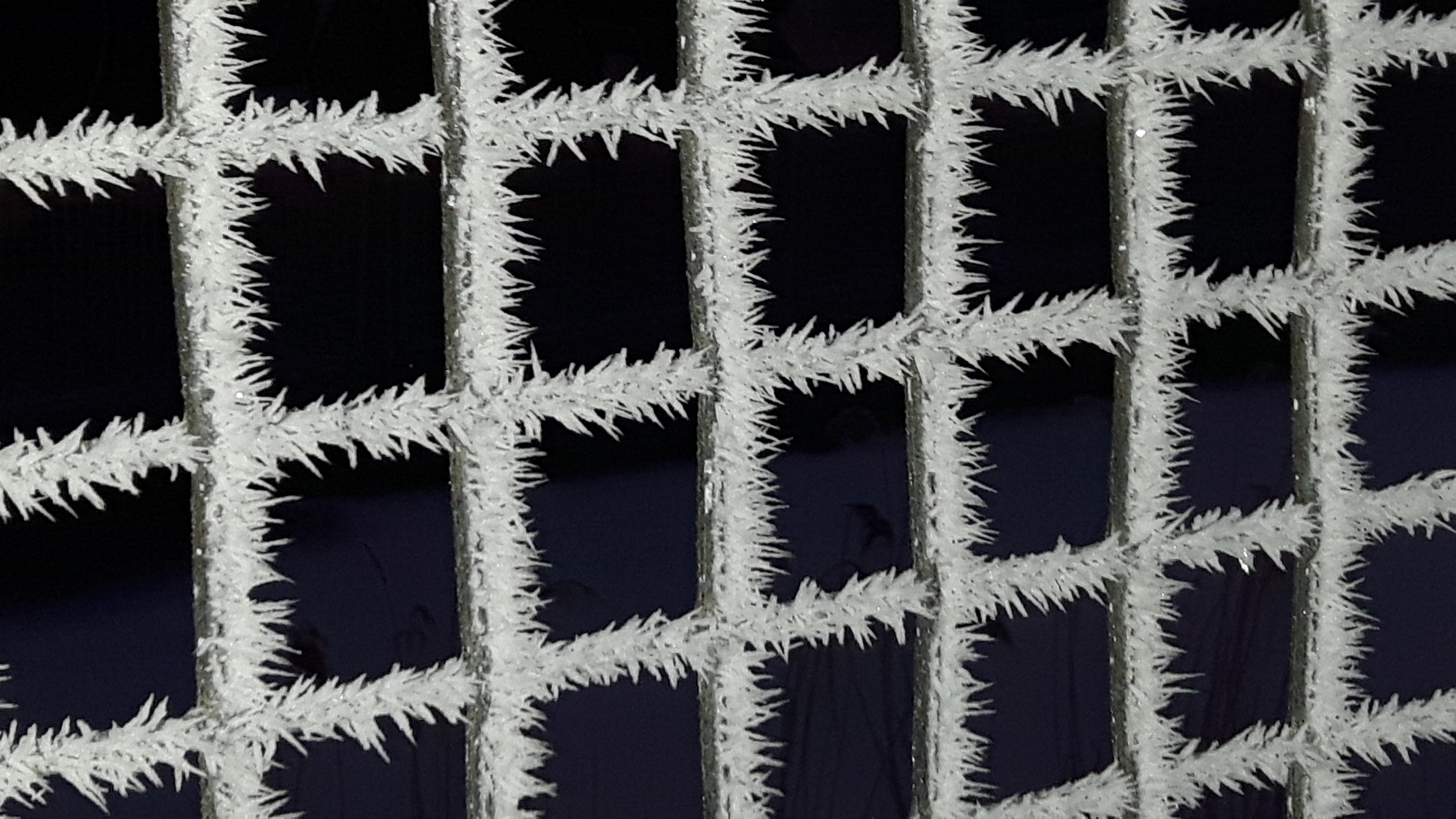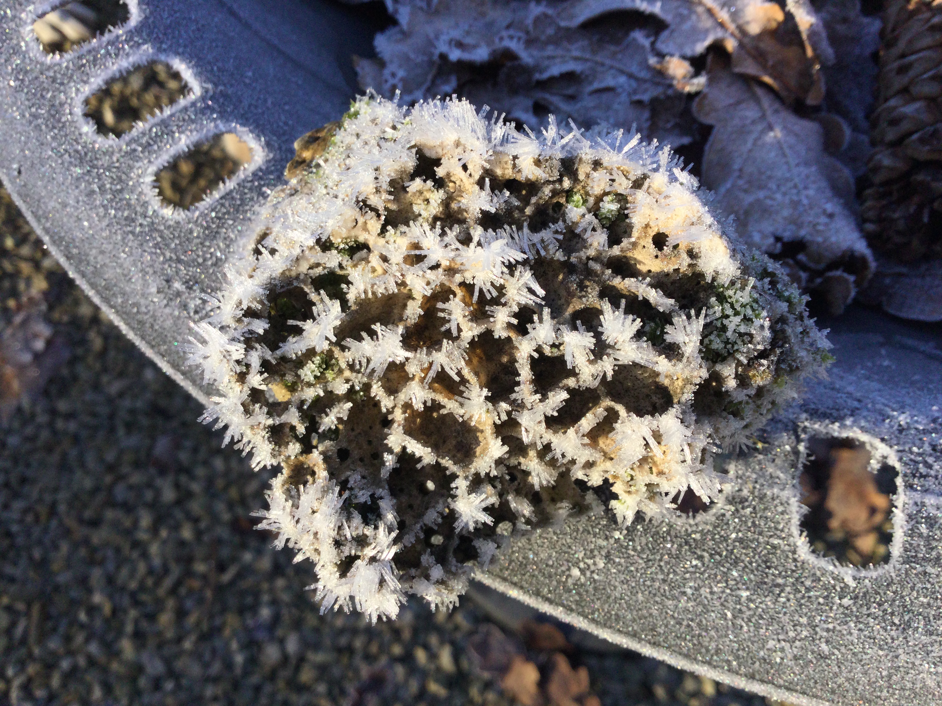 Wat een leuke foto! Grappig ook dat de steen als "kiemkristal" of substraat lijkt te hebben gewerkt. IJs is een prachtig mineraal (nog redelijk goed te "verzamelen" ook, nou ja op foto dan). Je afbeelding doet me denken aan een hek op het treinstation bij mij om de hoek. Heb dat jaren geleden eens gefotografeerd toen het vol hing met "ruige rijp". Alleen de naam al is prachtig toch?! Hoewel de kristalvorm bij jou anders is, vermoed ik dat je met een dergelijk fenomeen te maken hebt. Moest die foto van het hek even opsnorren, maar bij dezen.