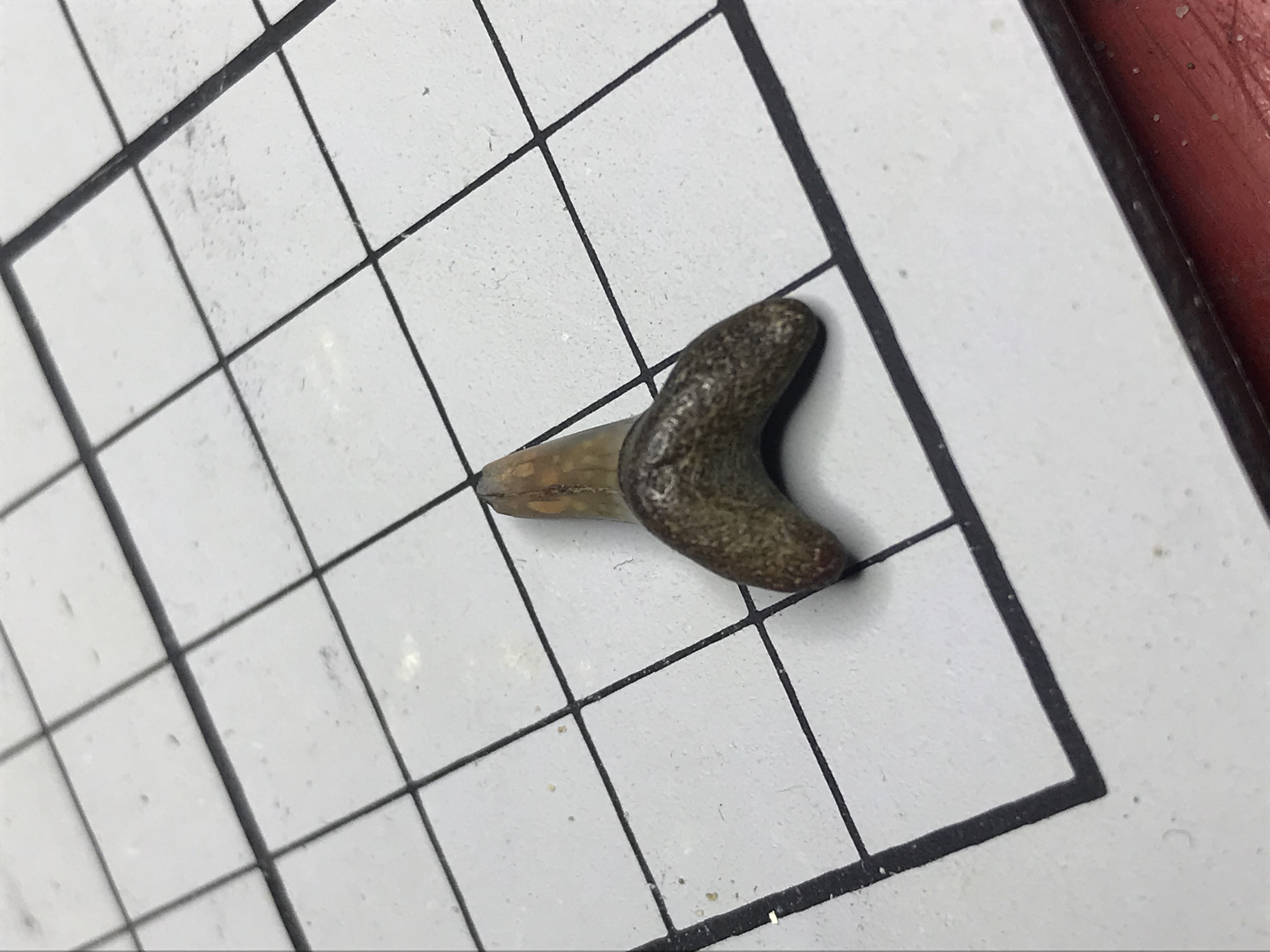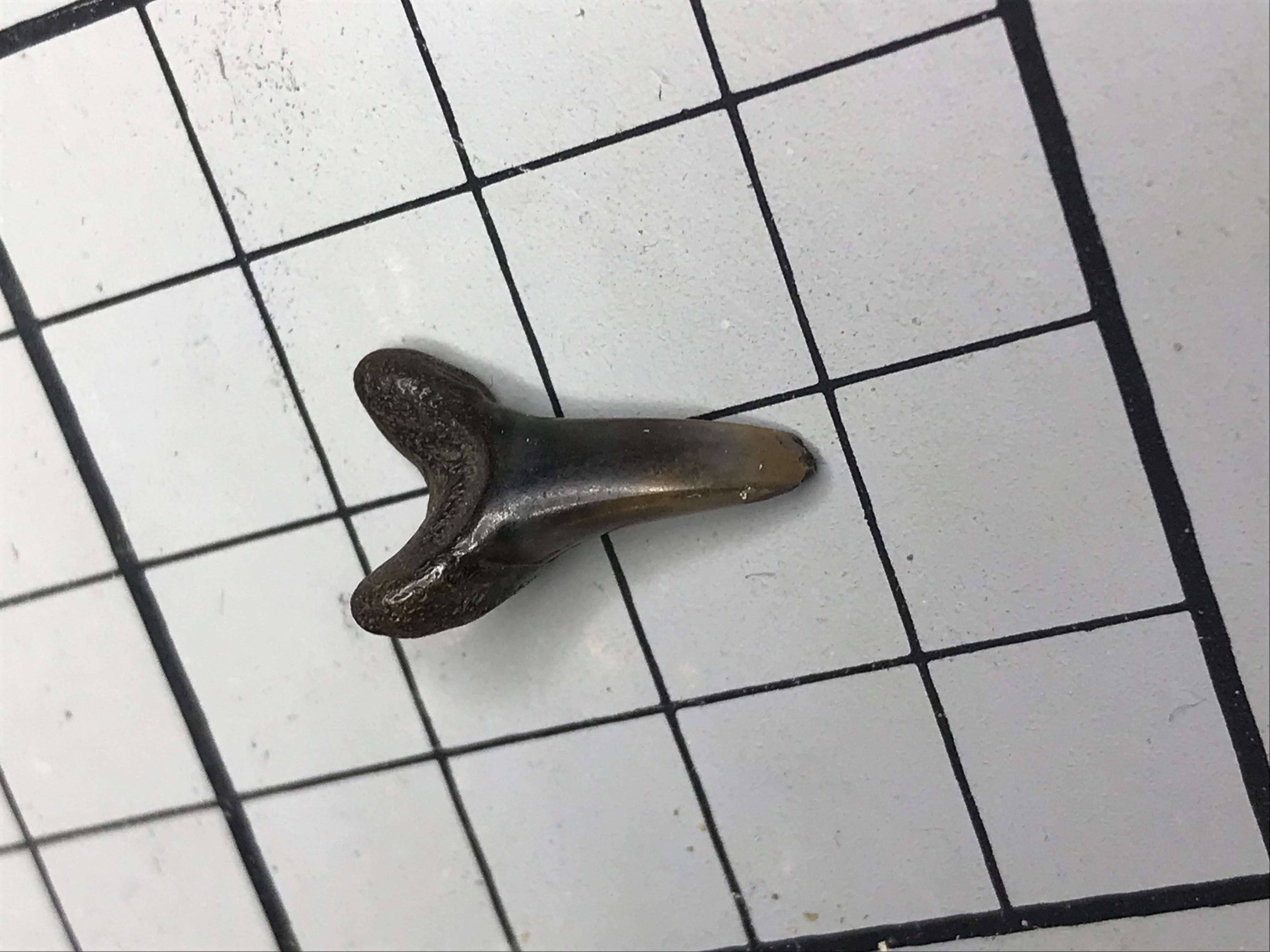 Deze tand tast ik ook nog bij in het duister. Ik denk aan A. vorax maar A. cuspidatus is ook nog een goede kanshebber. Heeft iemand een idee? Of is het misschien toch een andere soort? Het heeft trouwens best wel mooie kleuren op de kroon!