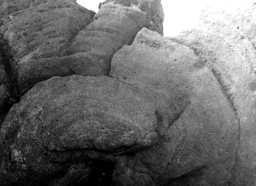 Daar vonden we deze vreemde stenen, fossielen,…? Eerst lijkt dat steen, dan hout en dan misschien iets sponsachtigs? Ik zou echt niet weten wat dit is. Is er een bepaald gesteente dat zo gevormd is?