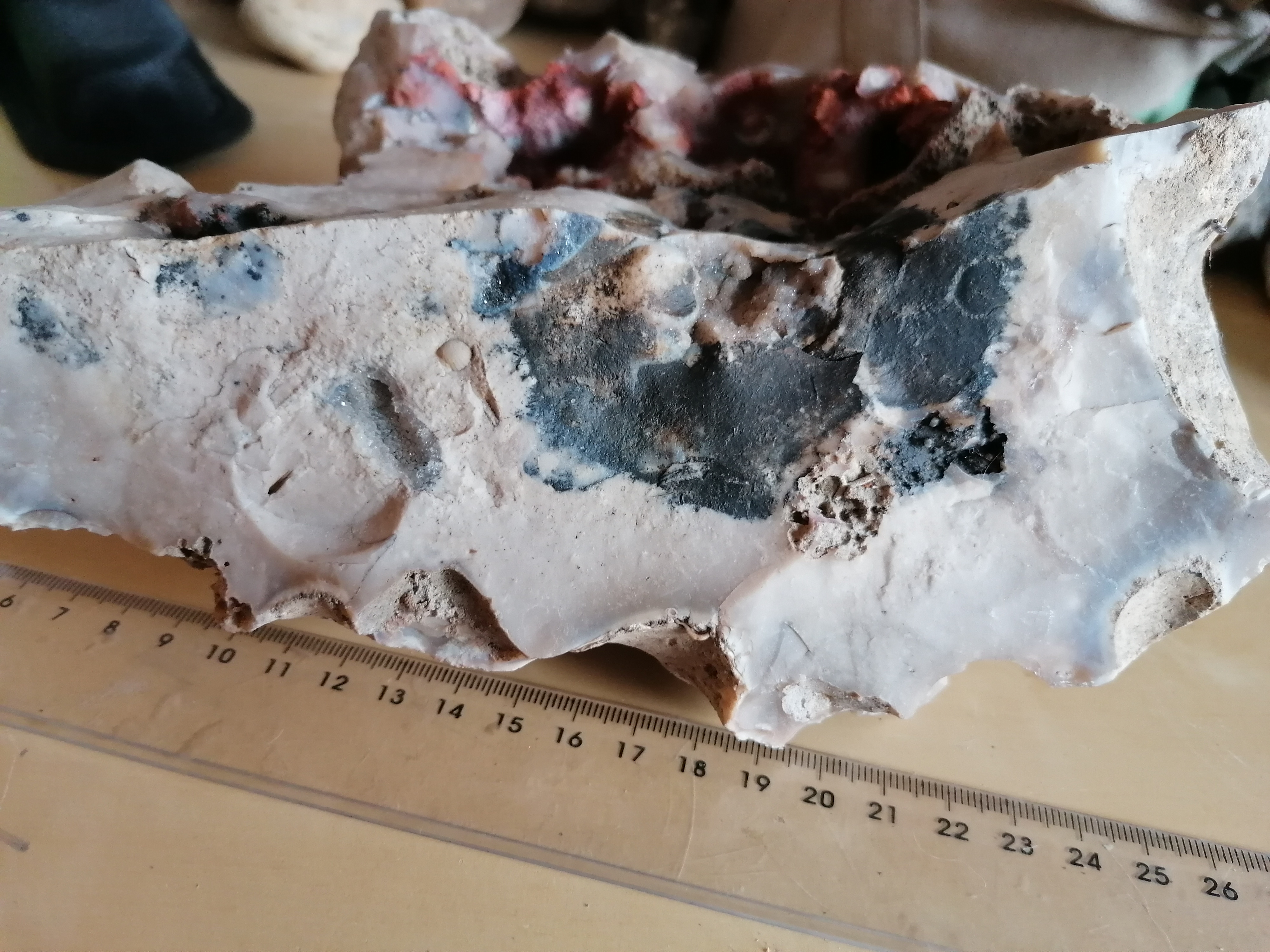 Alhoewel, ik heb me in eerste instantie afgevraagd of het überhaupt wel vuursteen was. Ik zag dankzij je duidelijke foto's zelfs een kleine brachiopode en een bryozoenstokje in de matrix. Dat heeft me over de twijfels heen geholpen. Ben wel benieuwd waar je hem hebt gevonden en of je de steen zelf hebt doorgeslagen. De kleuren zien er m.i. niet Noord-Nederlands uit.