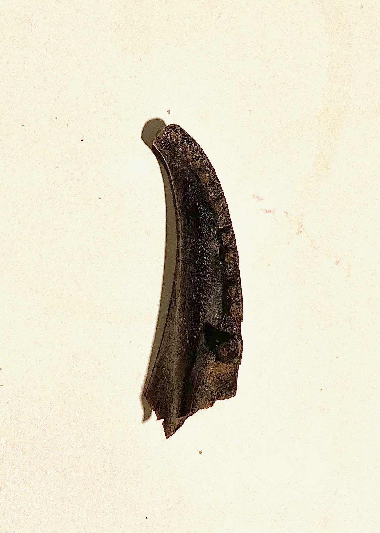 Gevonden op 9 april 2022 op de rechteroever van de Durme in Hamme (Ook-Vlaanderen, België) aan de monding van de Durme in de Schelde. Omgewoeld terrein. Ongeveer 4 cm groot. Lijkt een kaakbeentje met resten van tandjes. Enig idee wat dit is, en hoe oud dit kan zijn?