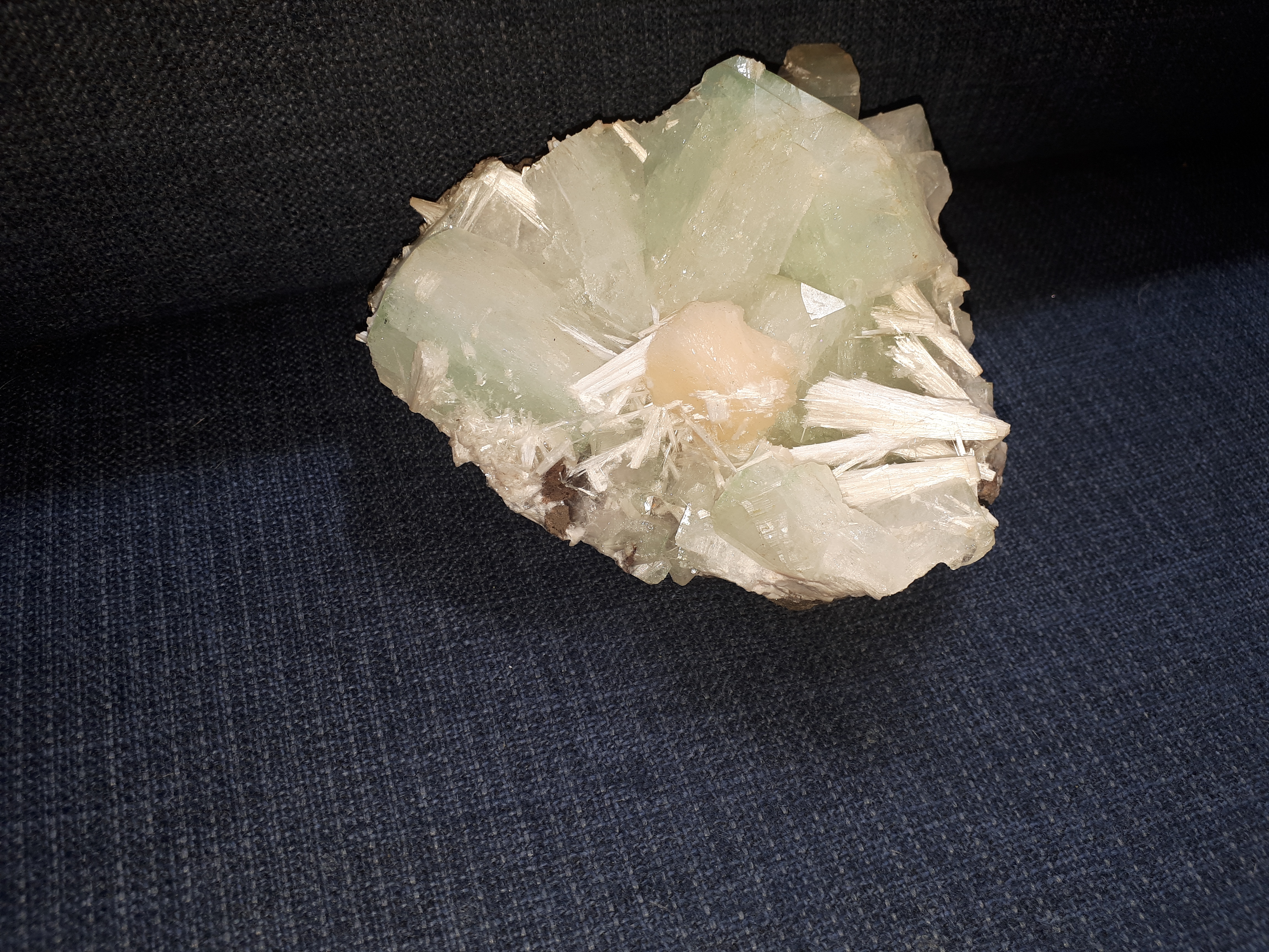 De wittere, vezelige bundels zouden wel eens strontianiet kunnen zijn. Dat komt vaker voor samen met calciet.
