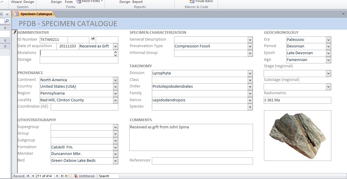 @alberto shark: Net als jij dat deed maak ik gebruik van een in Microsoft Access opgezette database. Vind dat wel prettig werken en je hebt veel vrijheid in hoe je de boel opzet. In antwoord op je vraag "en hoe is het terug te vinden?": Om een sterke link tussen een fossiel en de bijbehorende database-invoer te krijgen maak ik gebruik van 1) fysiek op het fossiel geschreven nummers en 2) duidelijke foto's van het fossiel in de database. Hieronder een foto van specimen TKTW0211 en een oude screenshot van de bijbehorende database-entry. Inmiddels staan er wel wat meer specimens geregistreerd en is ook de "storage" locatie bijgewerkt (de ladekasten en individuele lades zijn nu genummerd: een derde "link", die enorm helpt als je het fossiel dat bij een specifieke database-entry hoort zoekt).