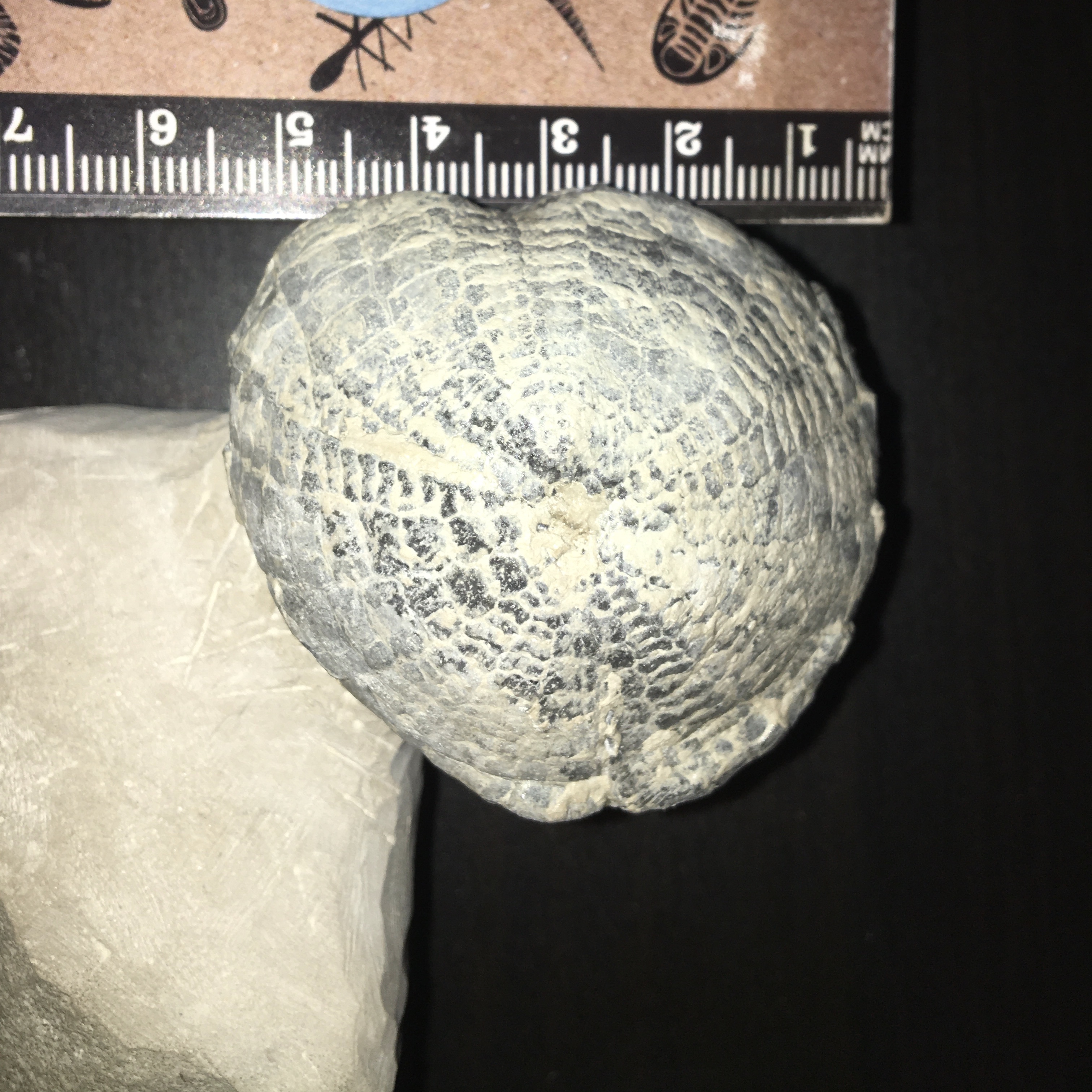 De afmetingen zijn 5,5cm hoogte op 5 cm breedte en 3 cm dikte. Hij komt uit het Krijt vermoed ik aangezien hij bij stenen lagen die ammonieten bevatten.