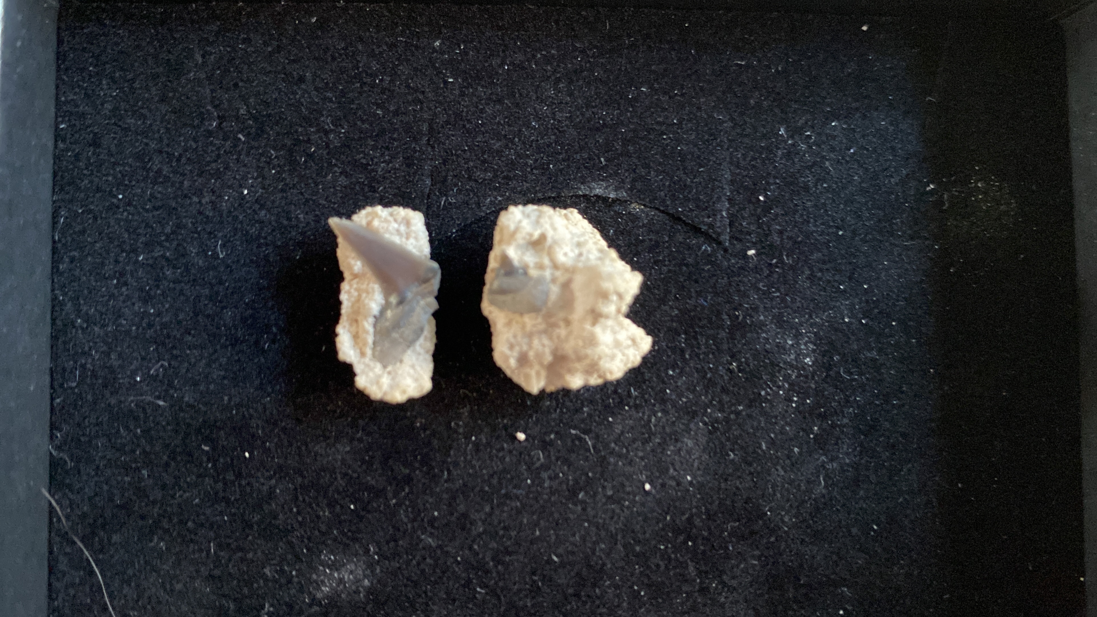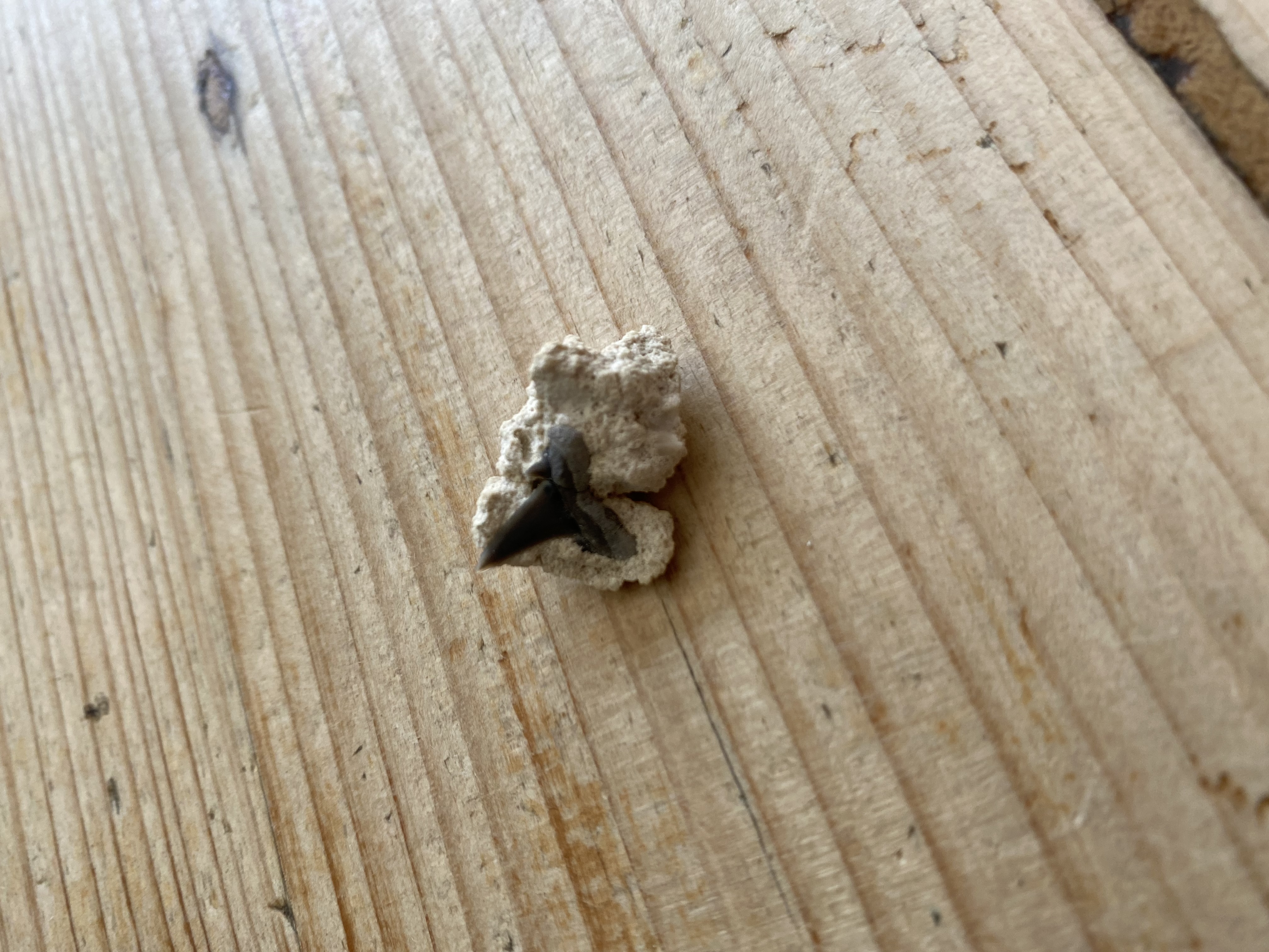 Ik heb laatst een haaientand gevonden, jammer genoeg in 2 stukken. Als het goed is is het een Serratolamna Serrata. De tand is ongeveer 1cm lang en 1cm breed.