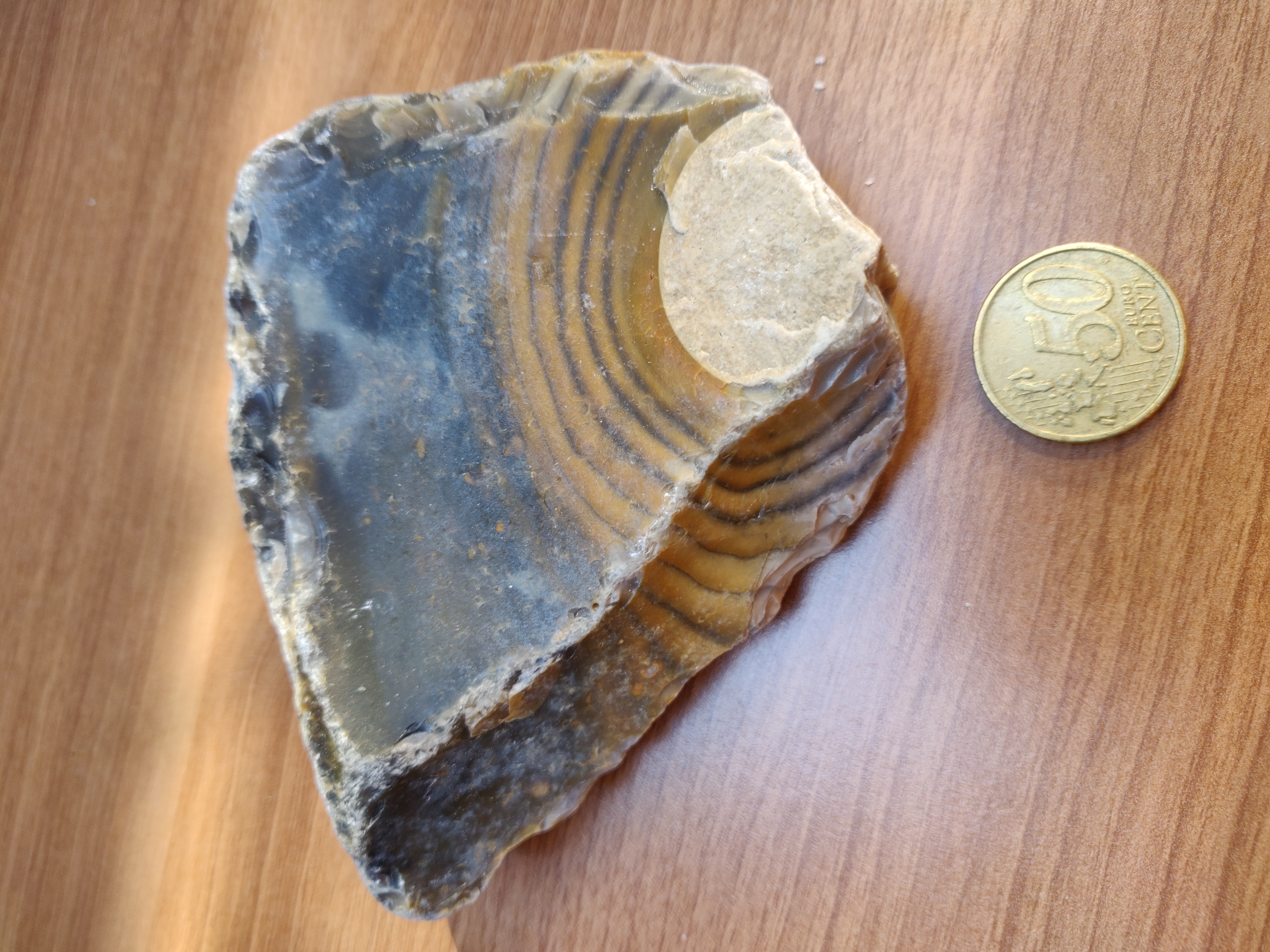 Dit is geen fossiel hout maar vuursteen of iets anders geologisch. Je ziet dit wel vaker, maar fossiel hout heeft een hout structuur en meer ringen en dat heeft deze steen niet. Misschien kan een ander je er meer over vertellen en ook over die ringen.