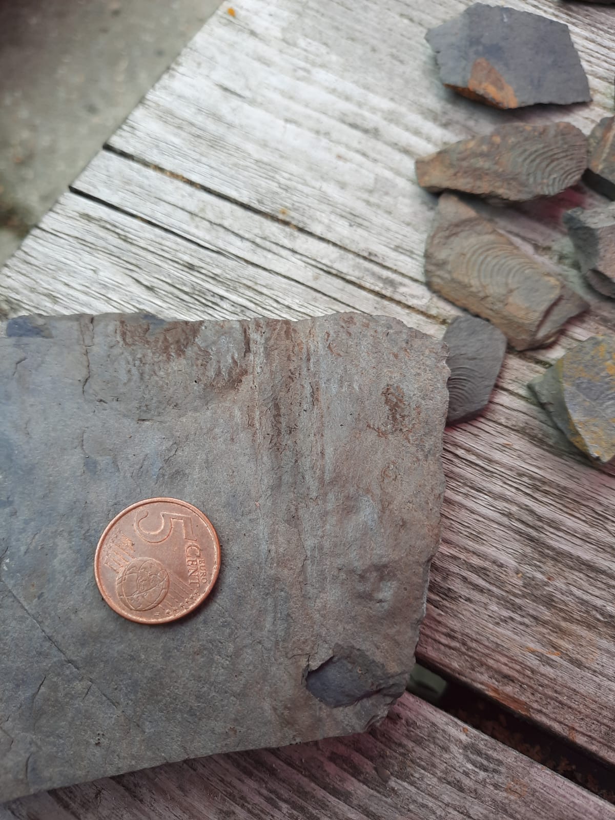 De locatie waar ik deze stukken gevonden heb staat bekend om zijn Cephalopoda. Er waren echter in hoofdzaak (afdrukken van) schelpen te vinden, waarvan geen enkel volledig exemplaar. Toch fragmenten kunnen vinden van een ammoniet, orthoceras en belemniet (afdruk).