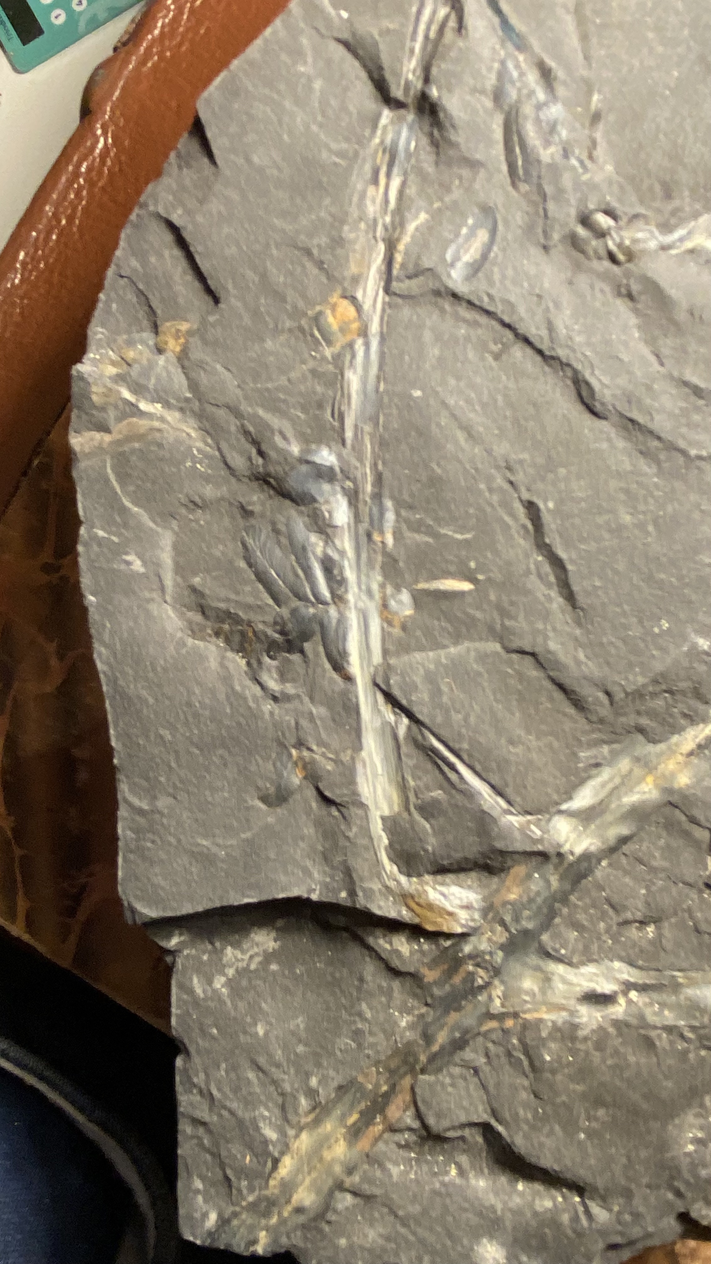 Bedankt voor de extra foto's. De pinnules die je kunt zien behoren zeker tot een neuropteride plant. Het is echter onduidelijk of deze pinnules ook in organische connectie staan met de "zich vertakkende tak". Deze tak is vrij apart, met zowel een bifurcatie als een splitsing in drieën. Dit laatste heb ik nog niet eerder in neuropteride bladvormen gezien. Kan natuurlijk zijn dat tak en pinnules niet bij elkaar horen? Sowieso een leuk stuk!