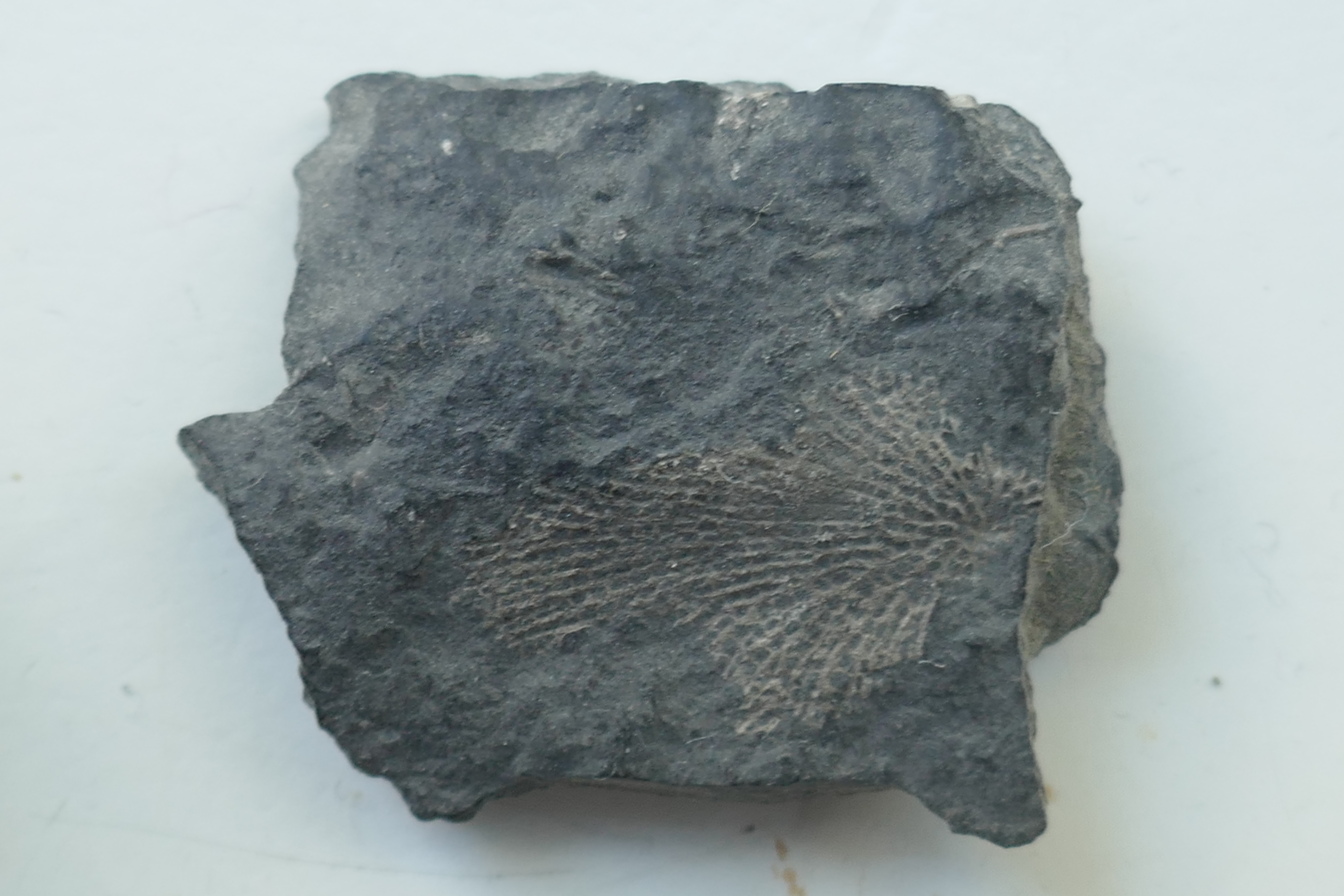 Voor zover mij verteld is het gesteente afkomstig uit België, en zou dateren uit het Carboon. Maar of dat klopt weet ik niet zeker. Ik heb er wat leuke fossielen uit kunnen halen, waarvan ik er hier een aantal laat zien (meer zodra ik de rest uit de schuur heb opgevist). Excuses voor het gebrek aan lineaal in de foto's.