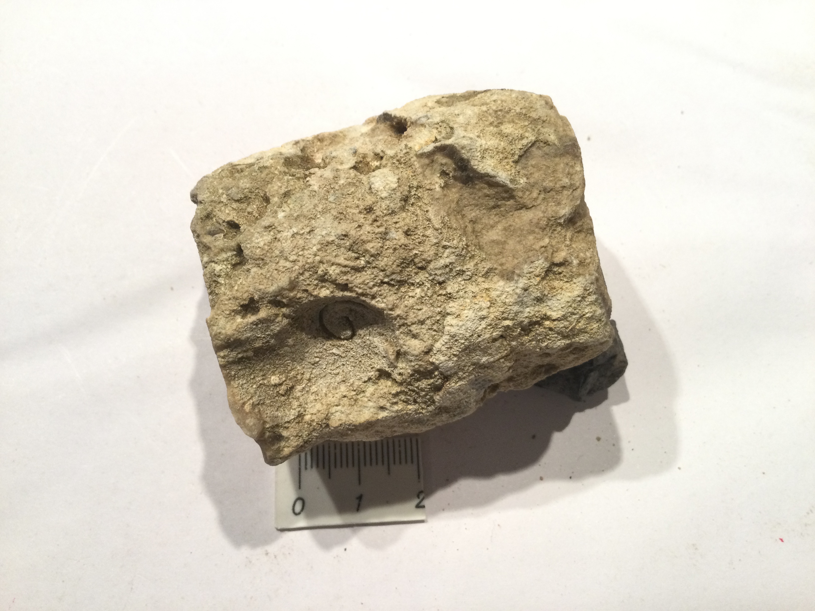 Vuursteen met stukjes zee-egel (boven) Beneden zit er n afdruk van n gastropode in.