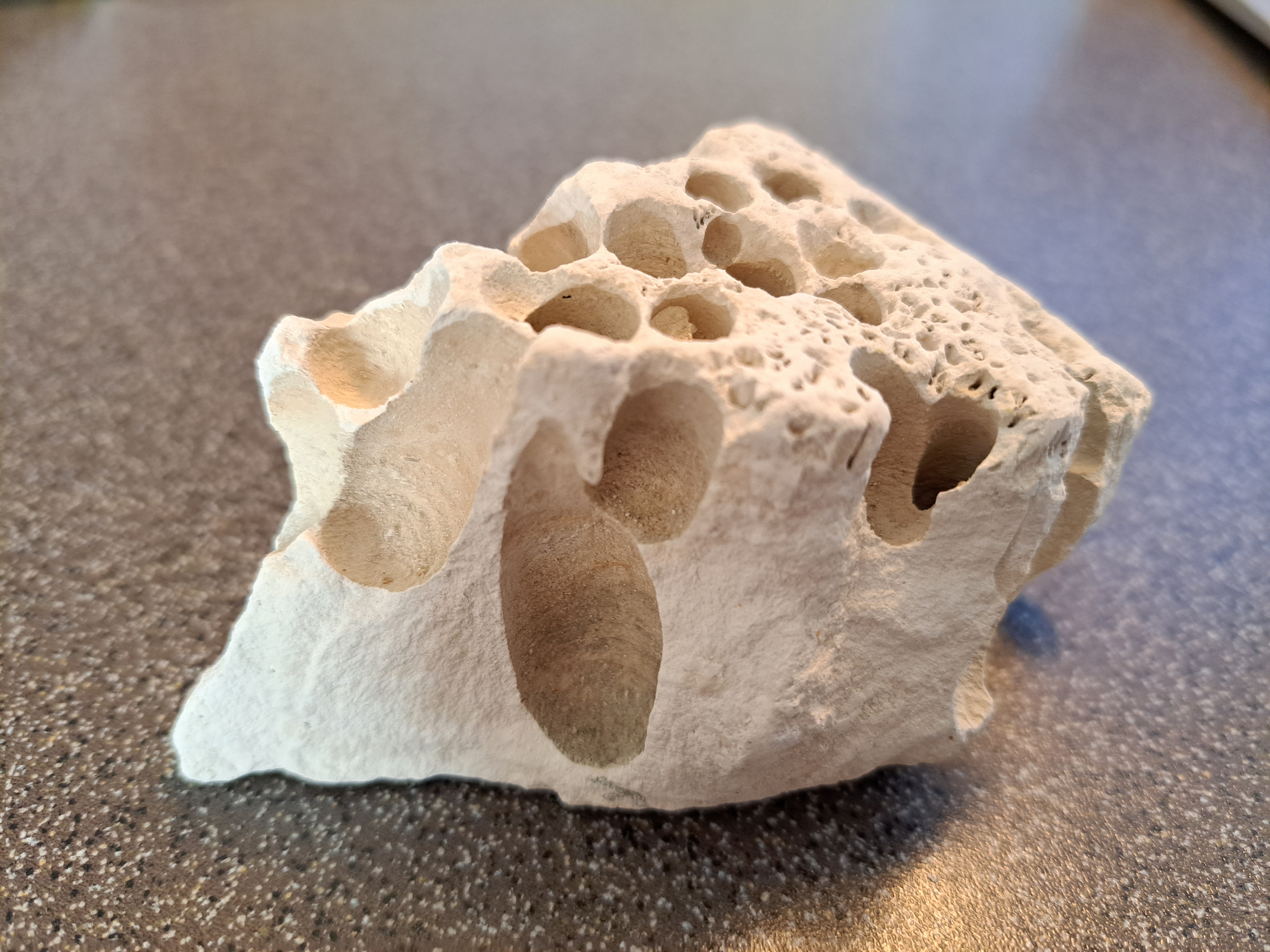 Het is een heel leuk stuk, maar de boorgaten zou ik niet fossiel noemen. De kalksteen is oud (uit het Krijt tijdperk, zeker 80 miljoen jaar oud, in dit geval), maar de gaten zijn er pas recentelijk in geboord (toen deze steen dus al op het strand lag).