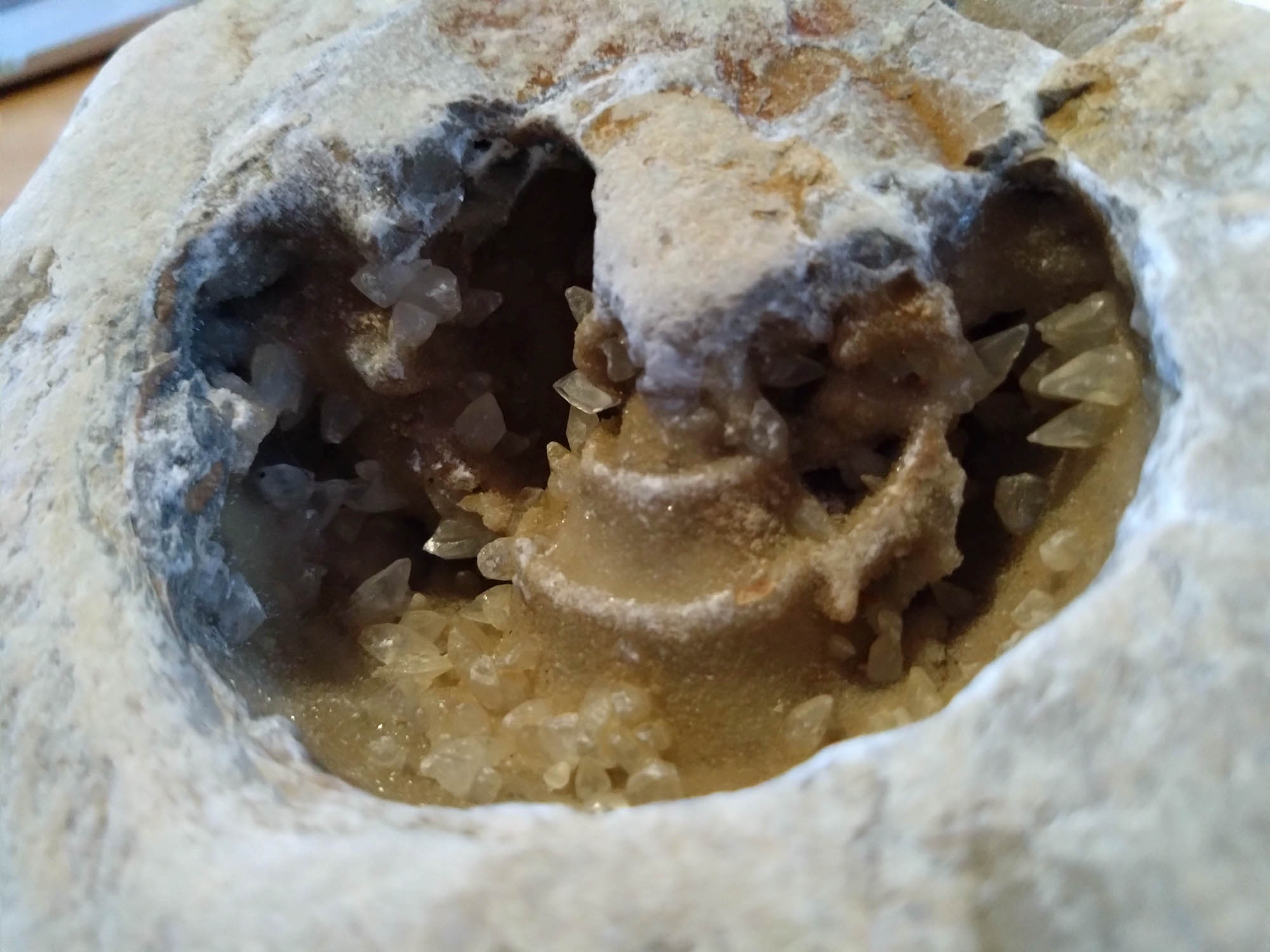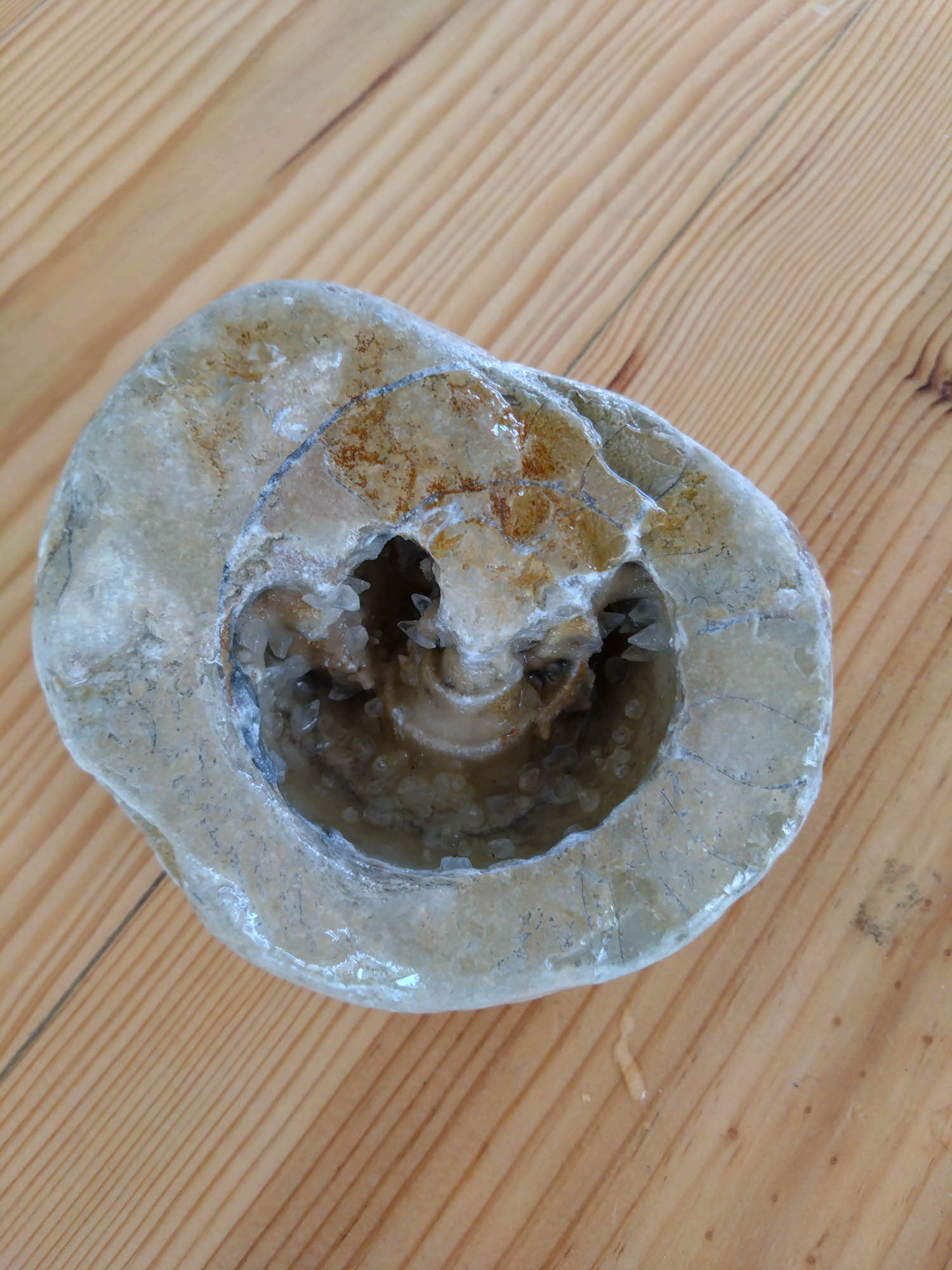 Gisteren op een strand aan de noordwestkant van Ile d'Oléron in Frankrijk een bijzondere steen aangetroffen. Heb er niet veel verstand van, maar vermoed een ammoniet waarin zich kristallen hebben gevormd. Klopt dit? Iemand die meer weet te vertellen over dit fossiel, bijvoorbeeld hoe zoiets ontstaat?