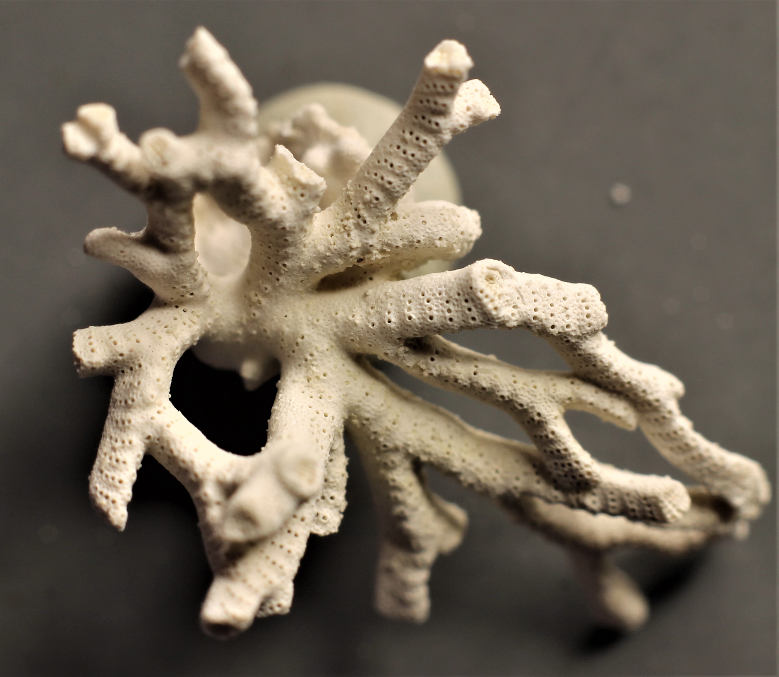 vandaag een mooi stilleven van een mosdiertje (vermoedelijk uit de familie Hippothoidae) dat rond een ander mosdiertje (Petalopora flexuosa?) gegroeit is.