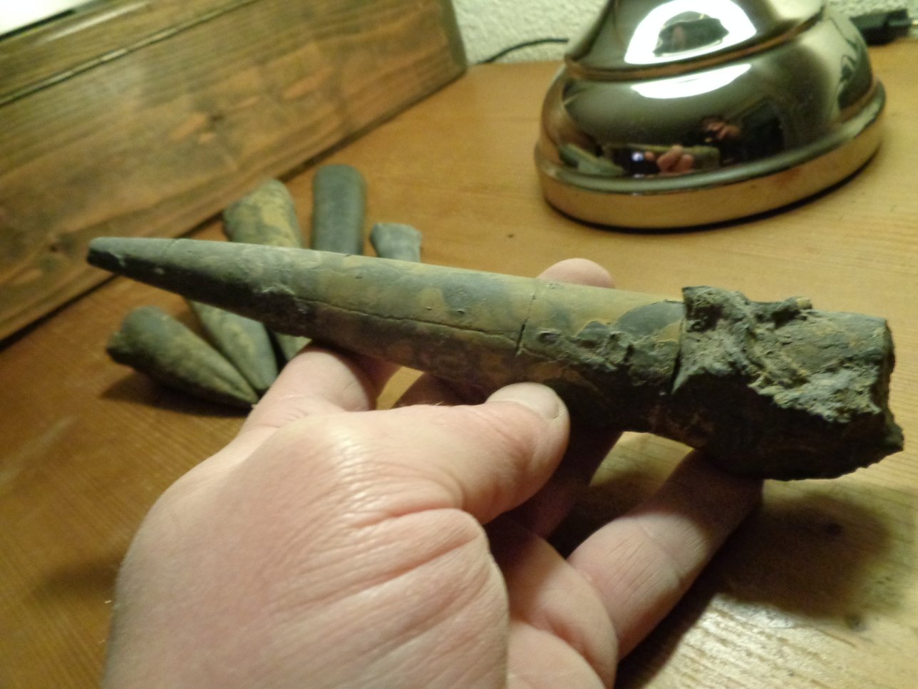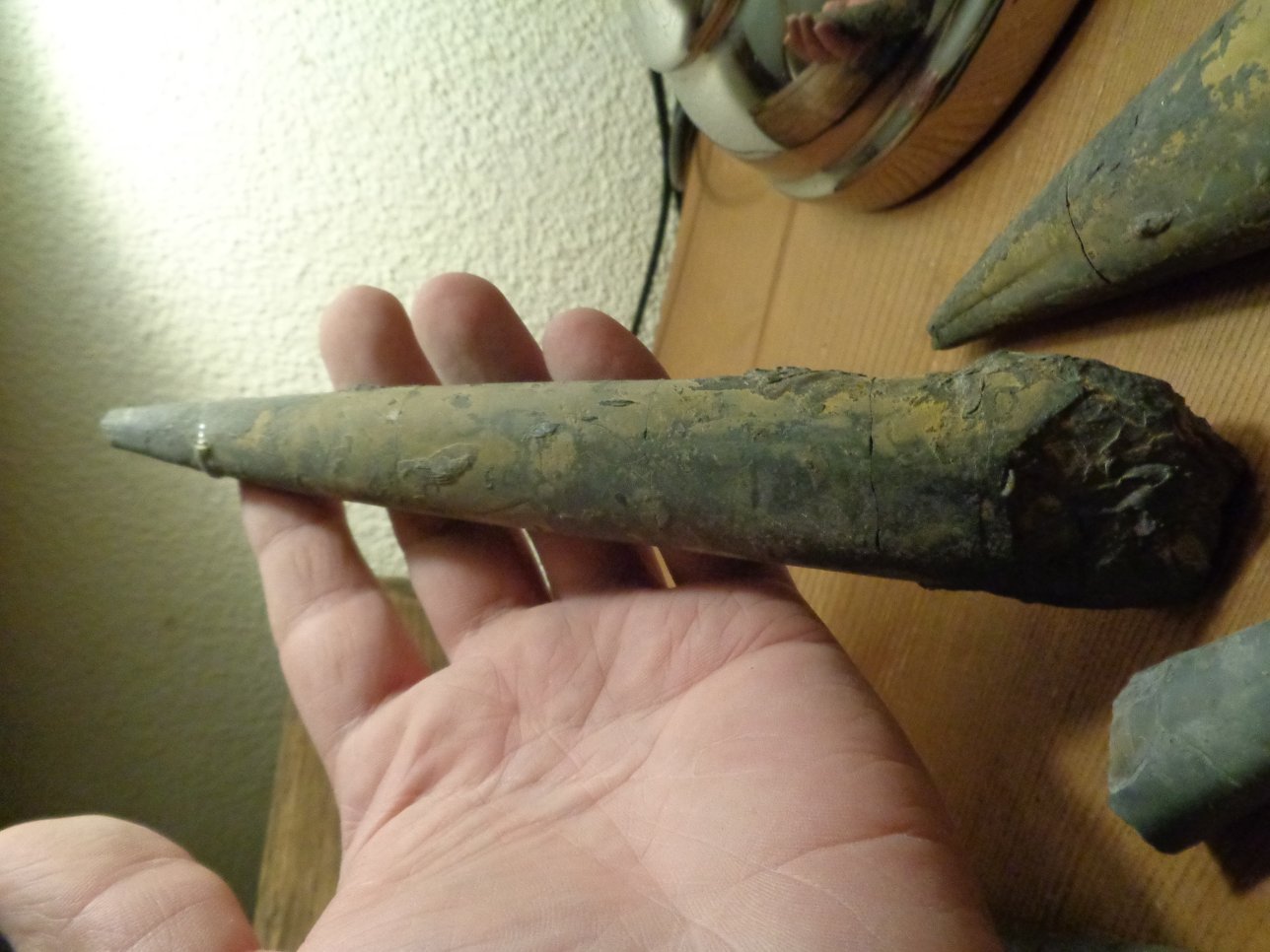Jouw exemplaar is al flink (te) afgeborsteld. Hier nog twee van mijn belemnieten van die plek, deze zijn nog niet geprepareerd.