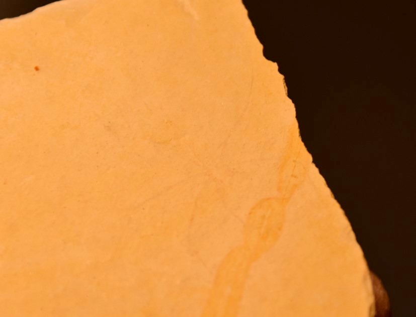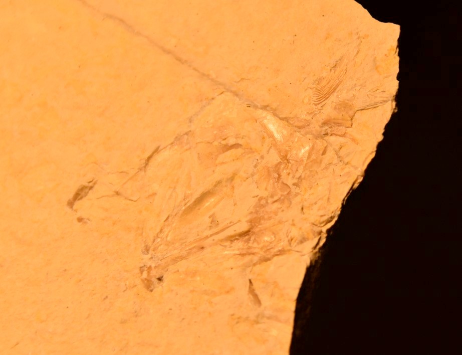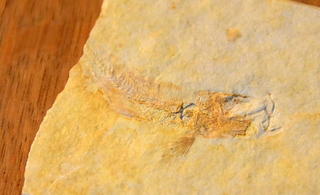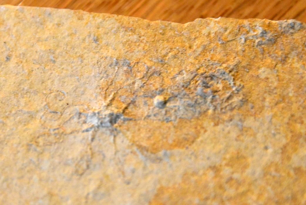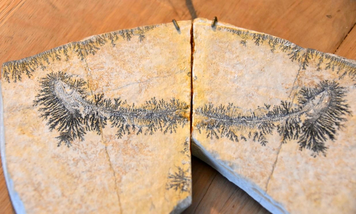 Graag vestig ik de aandacht dat er 9 duidelijke vis-fossielen onder zijn, waarvan 1 met origineel en afdruk, en 'mooi' afgezet met mangaan dendrieten.
