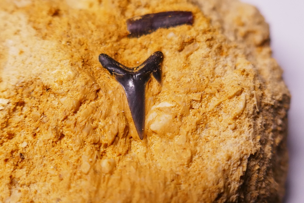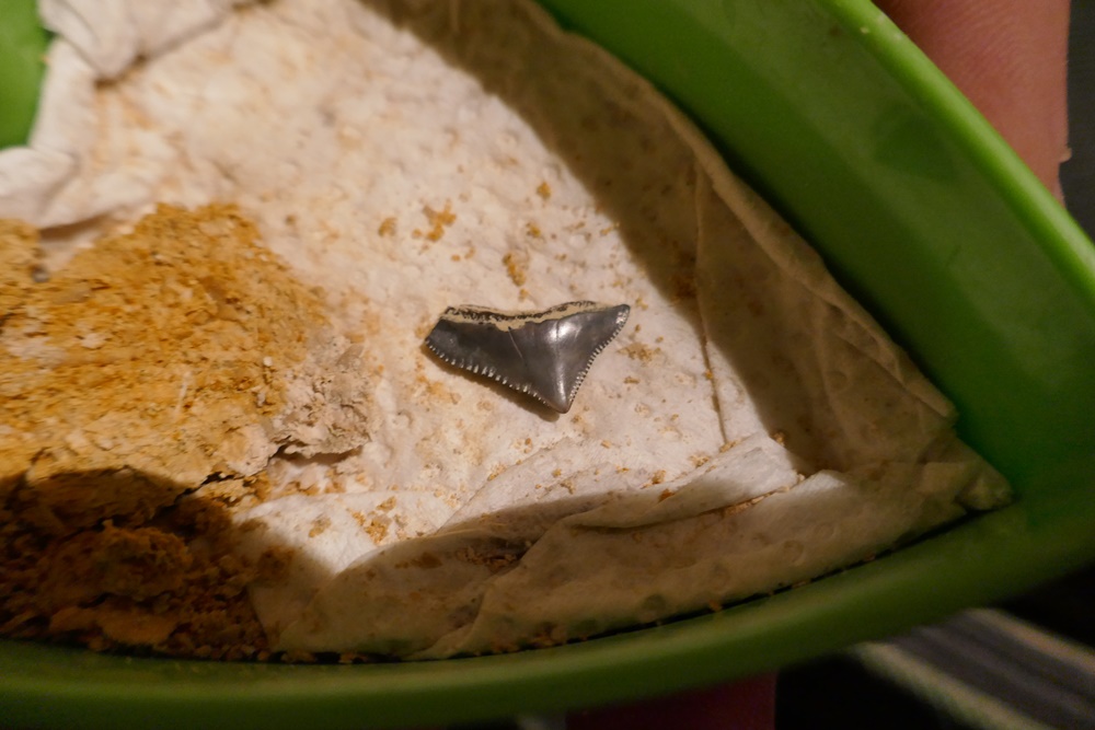 De mergel was boterzacht, dus het was erg makkelijk om fossielen los te krijgen. Ze heel houden, en niet op de grond te laten vallen was even onder de knie krijgen. Met een bakje eronder, zakmes en zaklamp aan het werk. Ik was de laatste die het eerste tandje had gevonden. Maar na de eerste ging het snel. Eenmaal gewend aan waar je naar moet kijken zag ik ze overal. Dat we op een zeer rijke plek zaten hielp natuurlijk ook