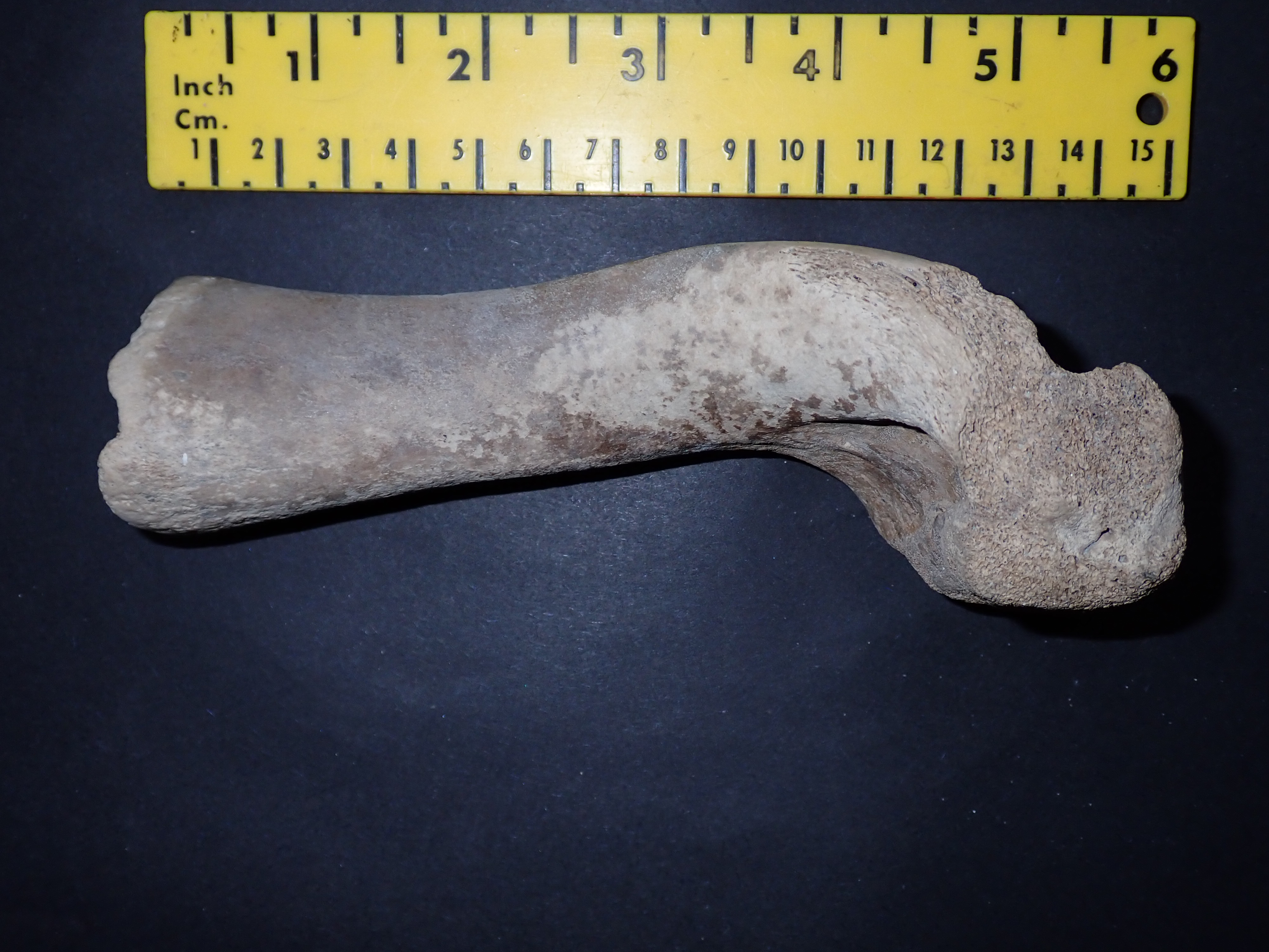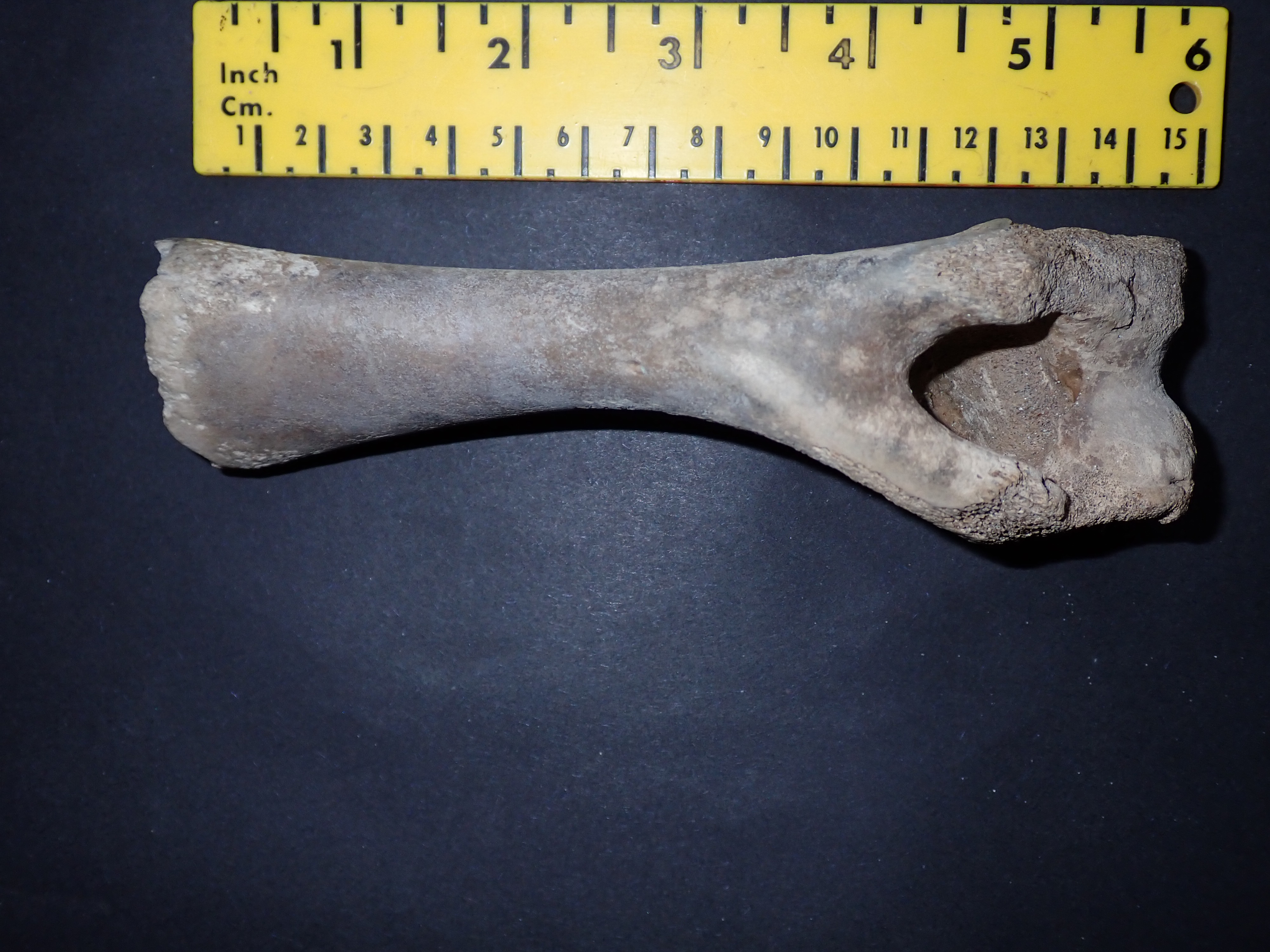 Volgens mij is dit een opperarmbeen, vanwege die gewelfde achterkant, van een groot zoogdier (geen mens).