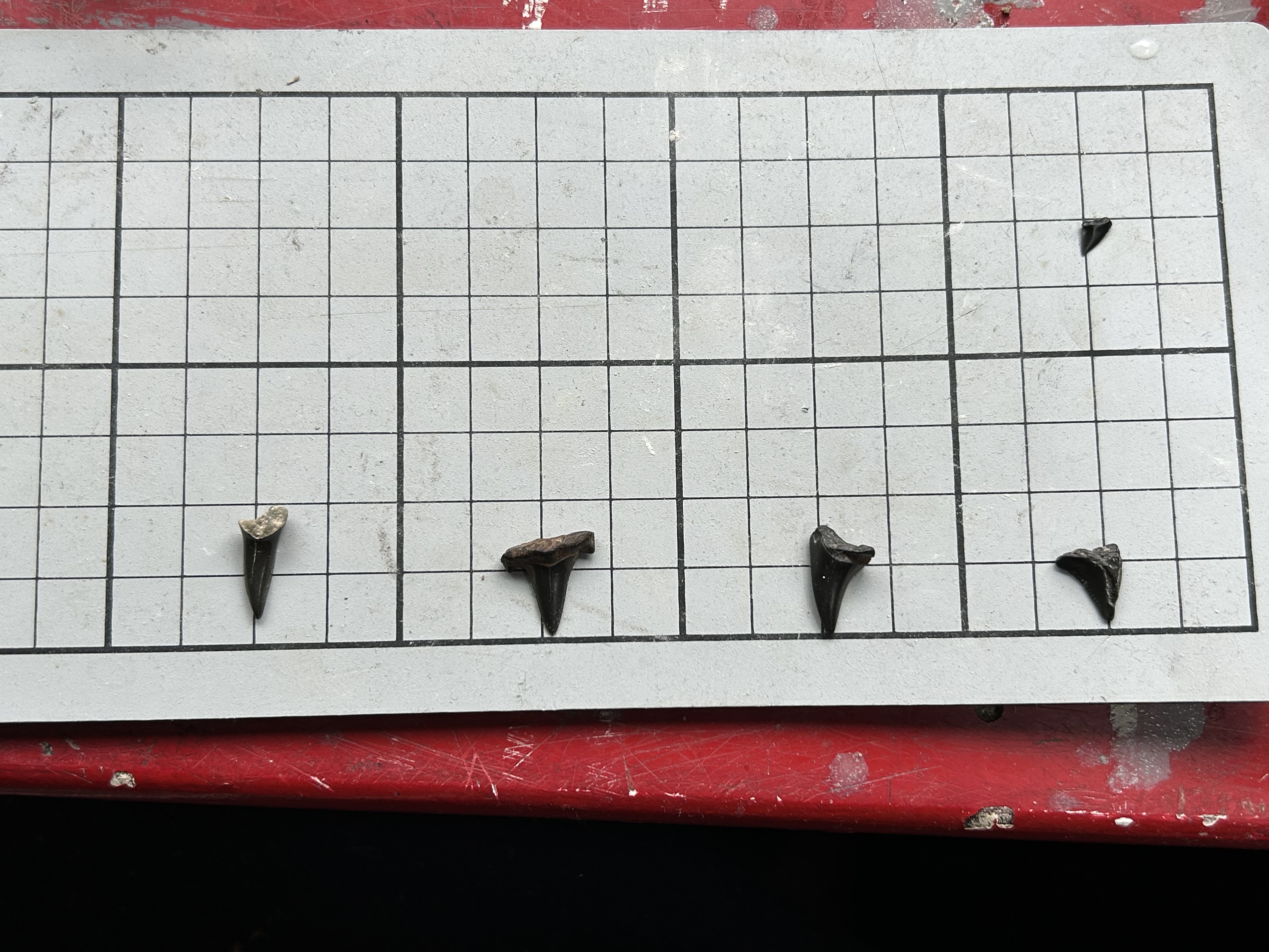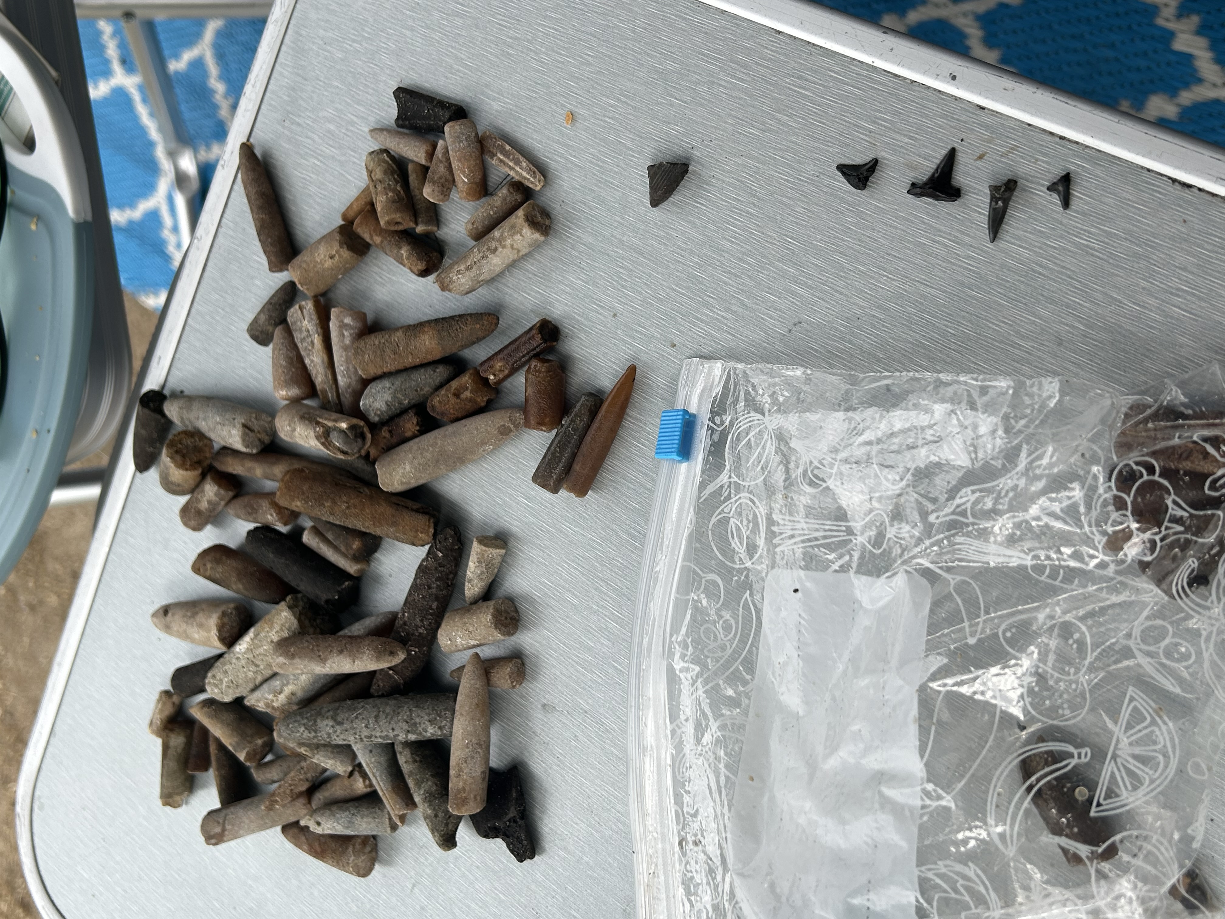 En dan nog een overzicht foto van alle haaientanden! Naast de haaientanden heb ik nog een crushed zee egel, wat middeleeuwse botten en kiesfragmenten, en een heleboel belemniet fragmenten😅