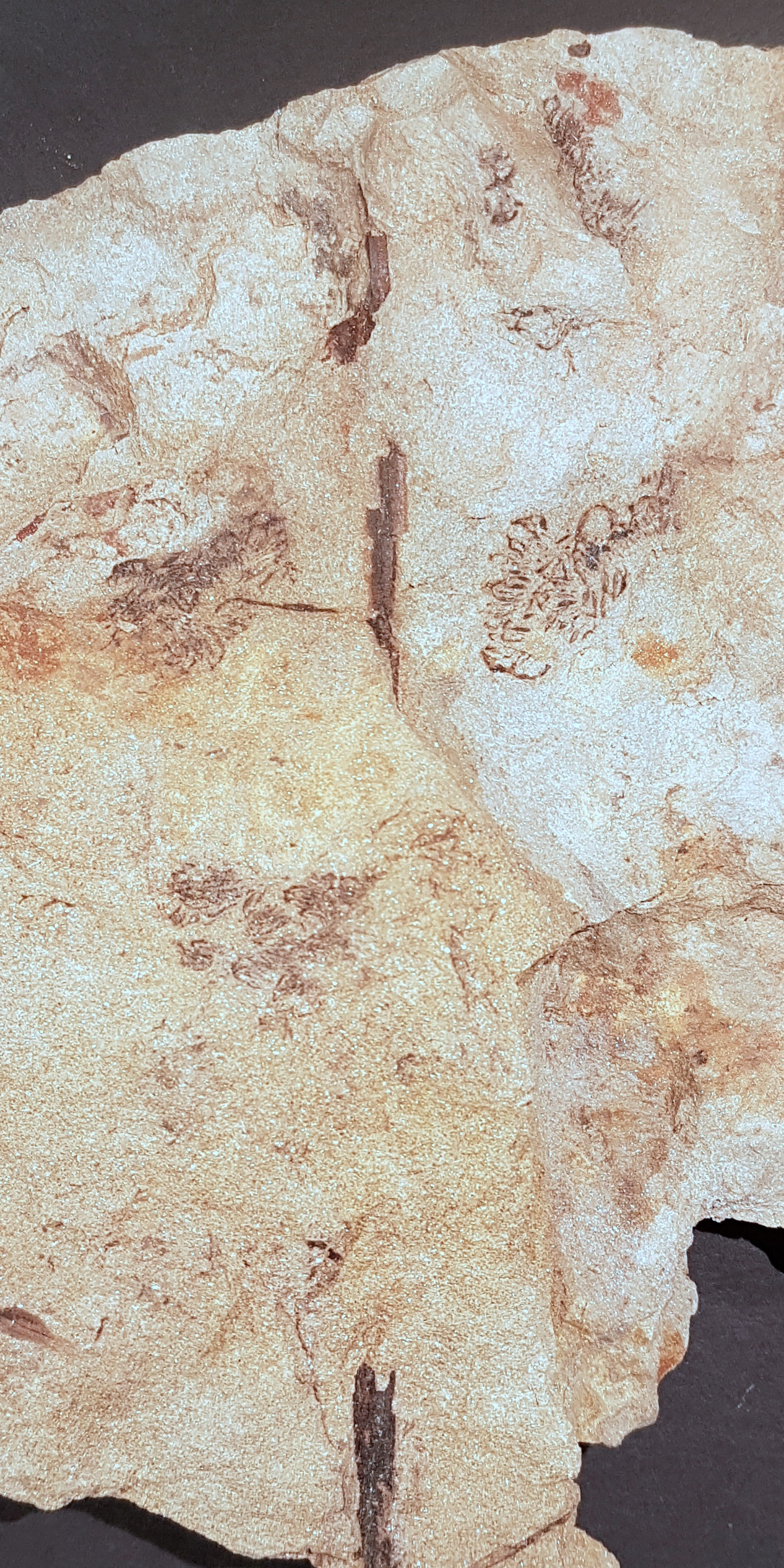 Voor de afwisseling leek het me leuk om eens wat plantfossielen uit het Devoon te laten zien hier op het forum. Ik heb de onderstaande stukken in 2017-2018 verzameld in "Carrière Suermondt" bij Moresnet (provincie Luik, België). Helaas bestaat deze groeve inmiddels niet meer (het terrein wordt momenteel gereed gemaakt voor huizenbouw, dacht ik). Maar voorheen dagzoomde hier de Evieux Formatie, een tot 200 m dik pakket van schalies, siltstenen en mica-rijke zandstenen uit het boven(ste) Fammenniaan. De Evieux Formatie staat bekend om haar rijke Boven-Devoonflora, zie bijvoorbeeld het prachtige standaardwerk van Stockmans (1948). De hier bijgevoegde foto's tonen vegetatieve en fertiele structuren (clusters sporangia) van Rhacophyton, een plant die waarschijnlijk tot de vroege varenachtigen gerekend mag worden. Zie voor verdere informatie eventueel ook Hellemond et al. (2019), waarin onze vondsten uit "de herfstjaren" van Carrière Suermondt in wat meer detail worden beschreven.