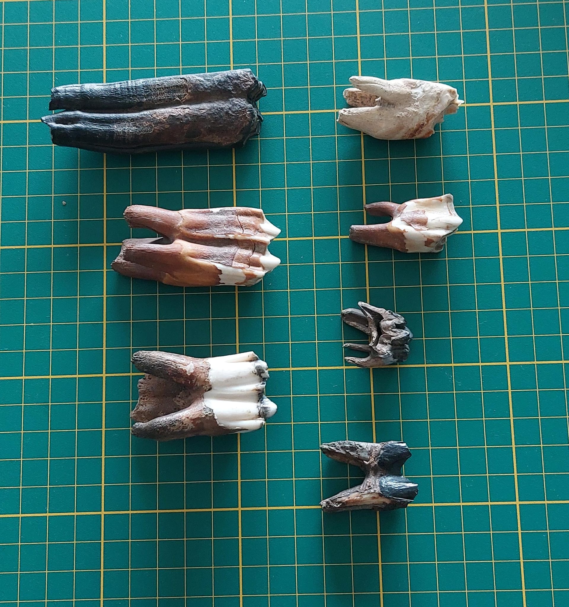 Uit een erfenis een set tanden. Helaas weet ik niet waar ze vandaan komen, maar ik vermoed dat het eigen vondsten zijn, mogelijk van de zandmotor. Ik denk dat het ijstijdfossielen zijn. Weten jullie welke dieren dit zijn? De vakjes op de achtergrond zijn 1cm.