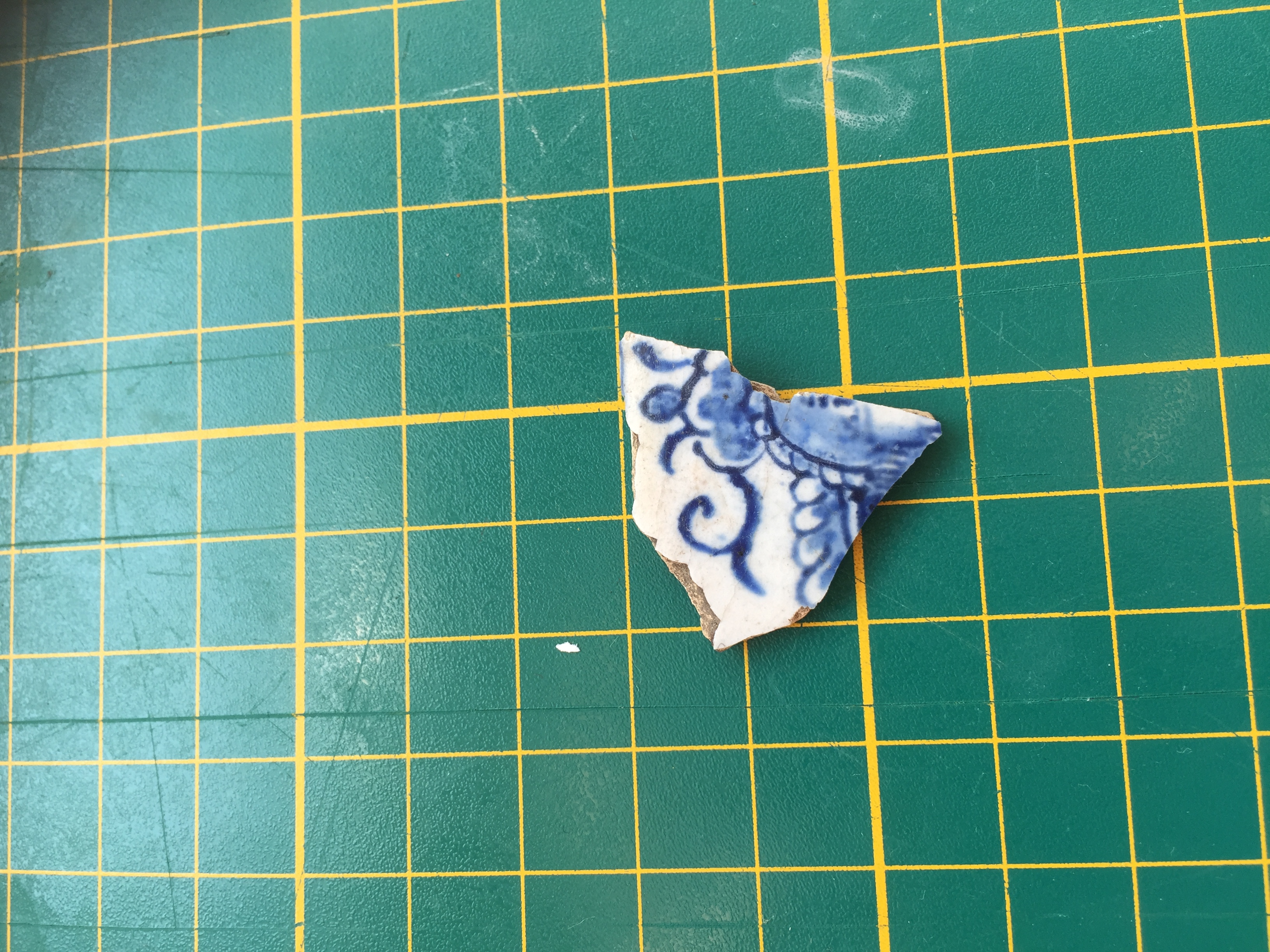 Dat scherfje delftsblauw lijkt me "echt oud", deze ziet er namelijk handgeschilderd uit. Het lijkt me 17-18e eeuw maar handgeschilderd deltsblauw werd ook nog veel in de 19e eeuw gemaakt.