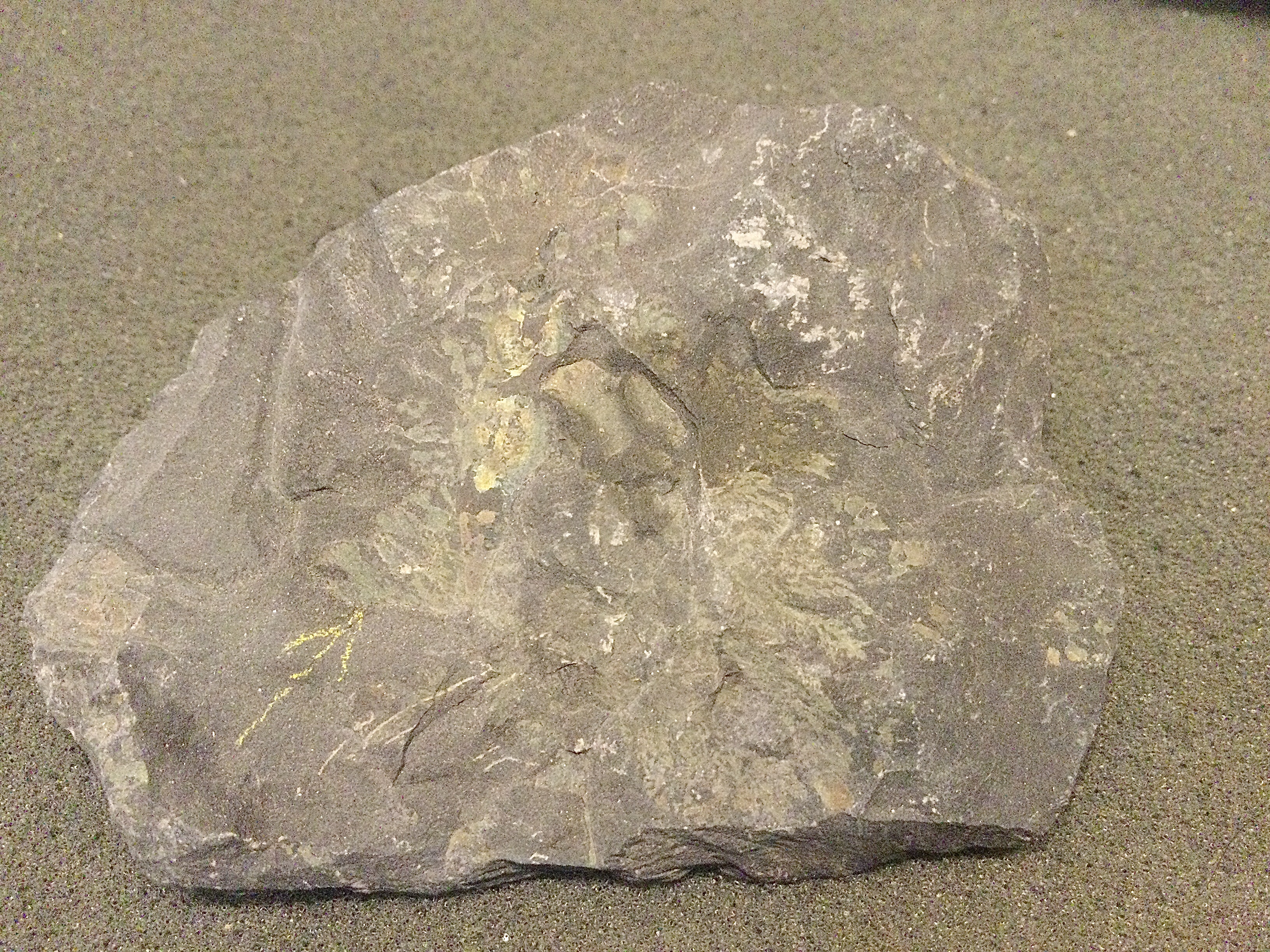 Het gesteente lijkt me in elk geval een silicaat. Het okerkleurige materiaal zou Limoniet kunnen zijn, dat een verwerings-overblijfsel is van oorspronkelijk een ander ijzerhoudend mineraal, zoals hematiet of goethiet