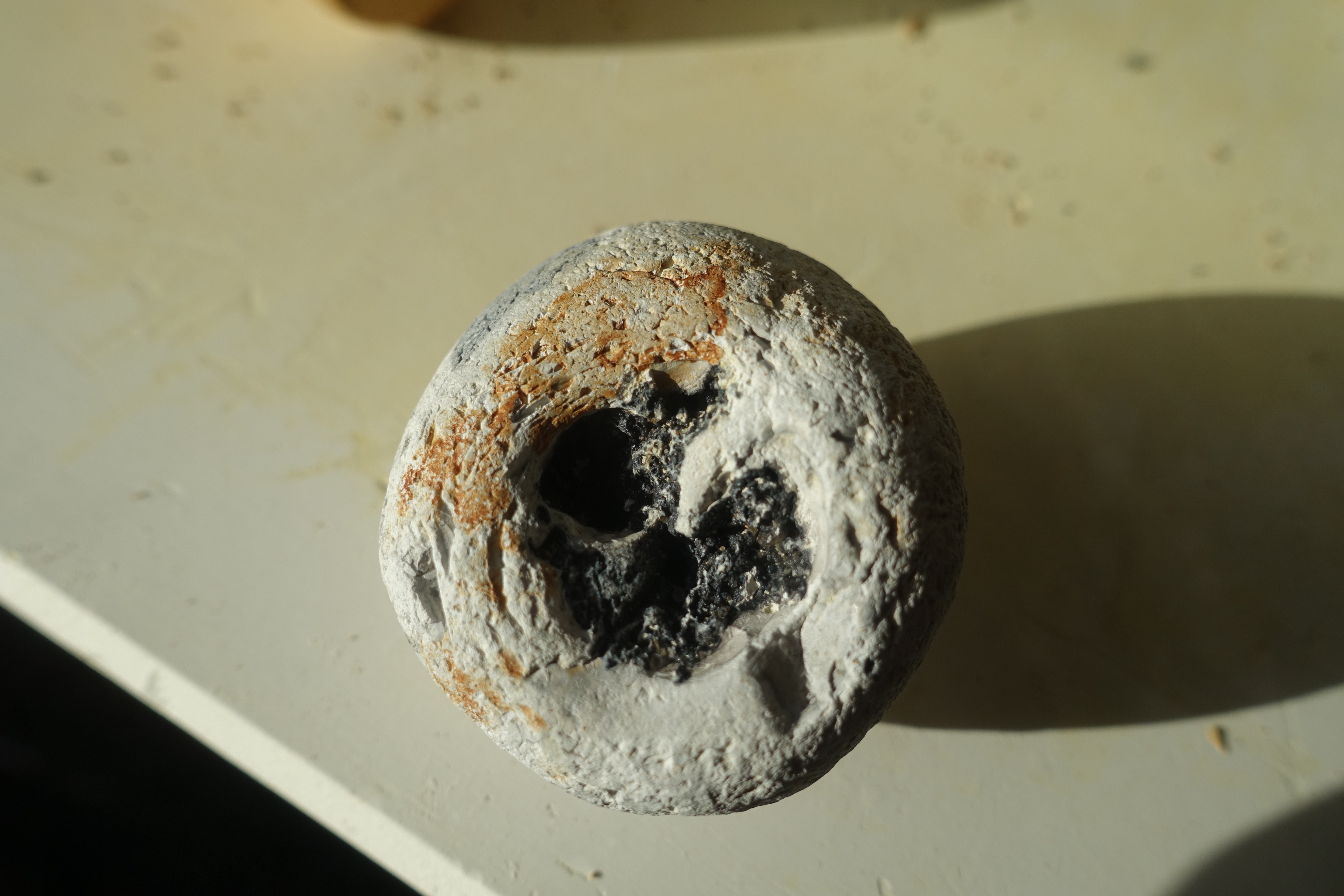 Hallo, weet iemand wat de zwarte binnenkant van deze steen is? Het lijkt aan de buitenkant op een zee-egel, maar er zijn weinig aanknooppingpunten. Ik ben zo benieuwd waar de zwarte binnenzijde uit bestaat.