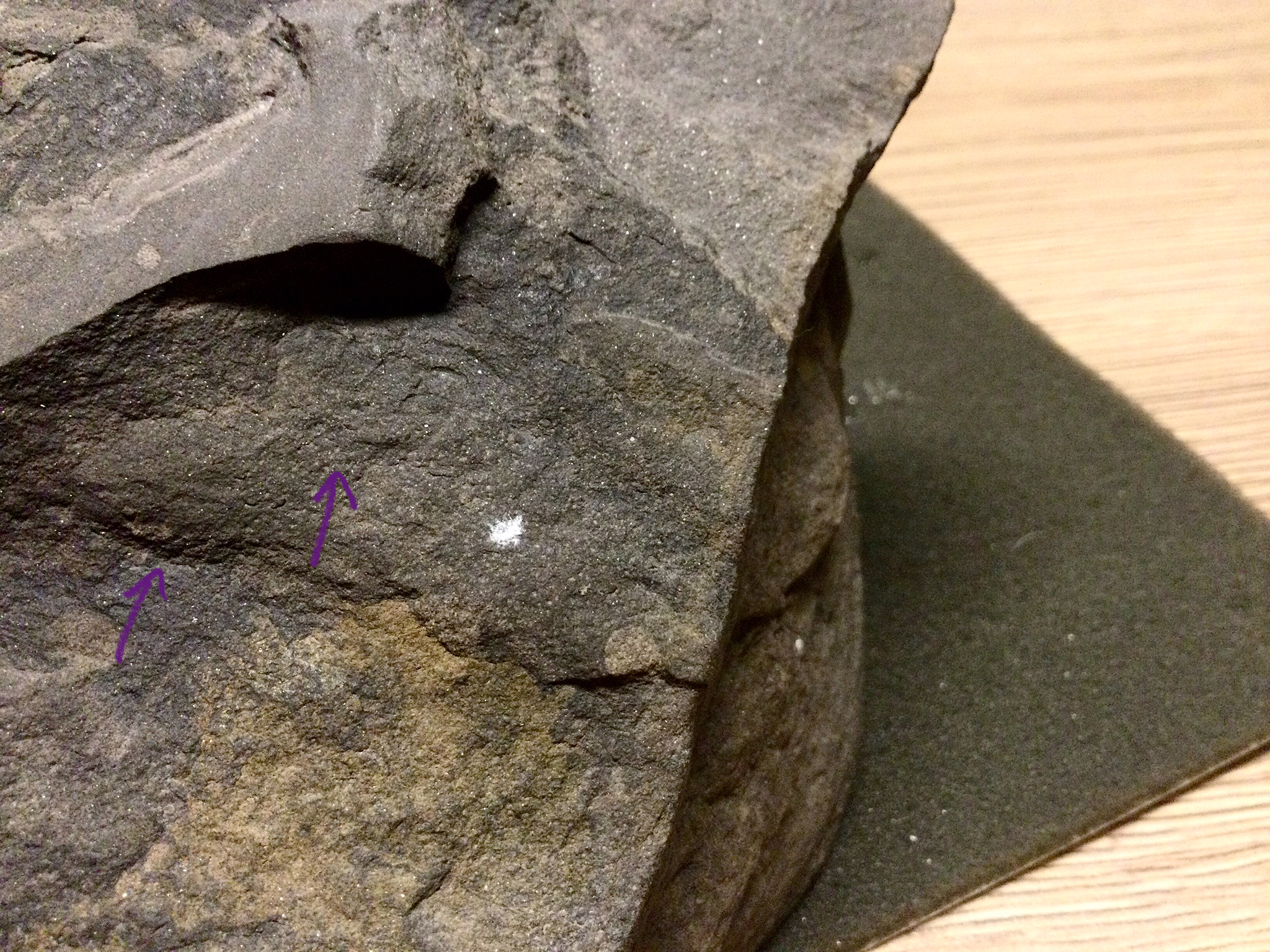 Wat een leuke update! Blij om te horen dat het inderdaad om een rhizodontide visschub blijkt te gaan. Ik herken niet direct iets in de verdere structuren die je met pijlen aangeeft, maar dat zegt niet zoveel. Keertje onder de binoculair leggen wil misschien helpen?