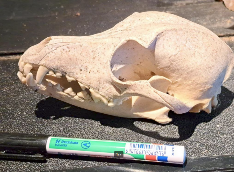 Is dit een fossiele schedel van een hond of van een wolf? Ik heb deze zojuist gekocht voor mijn dochter. Is ongeveer 15 cm lang op een paar onderste voortanden is soort van aanslag steen te zien.