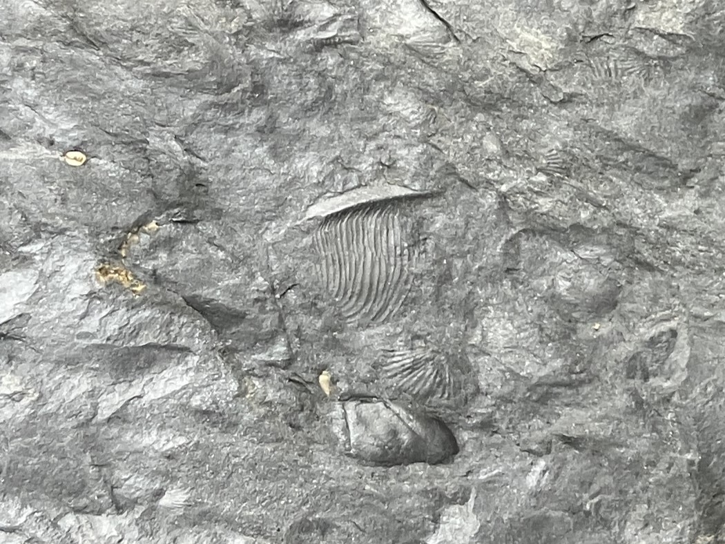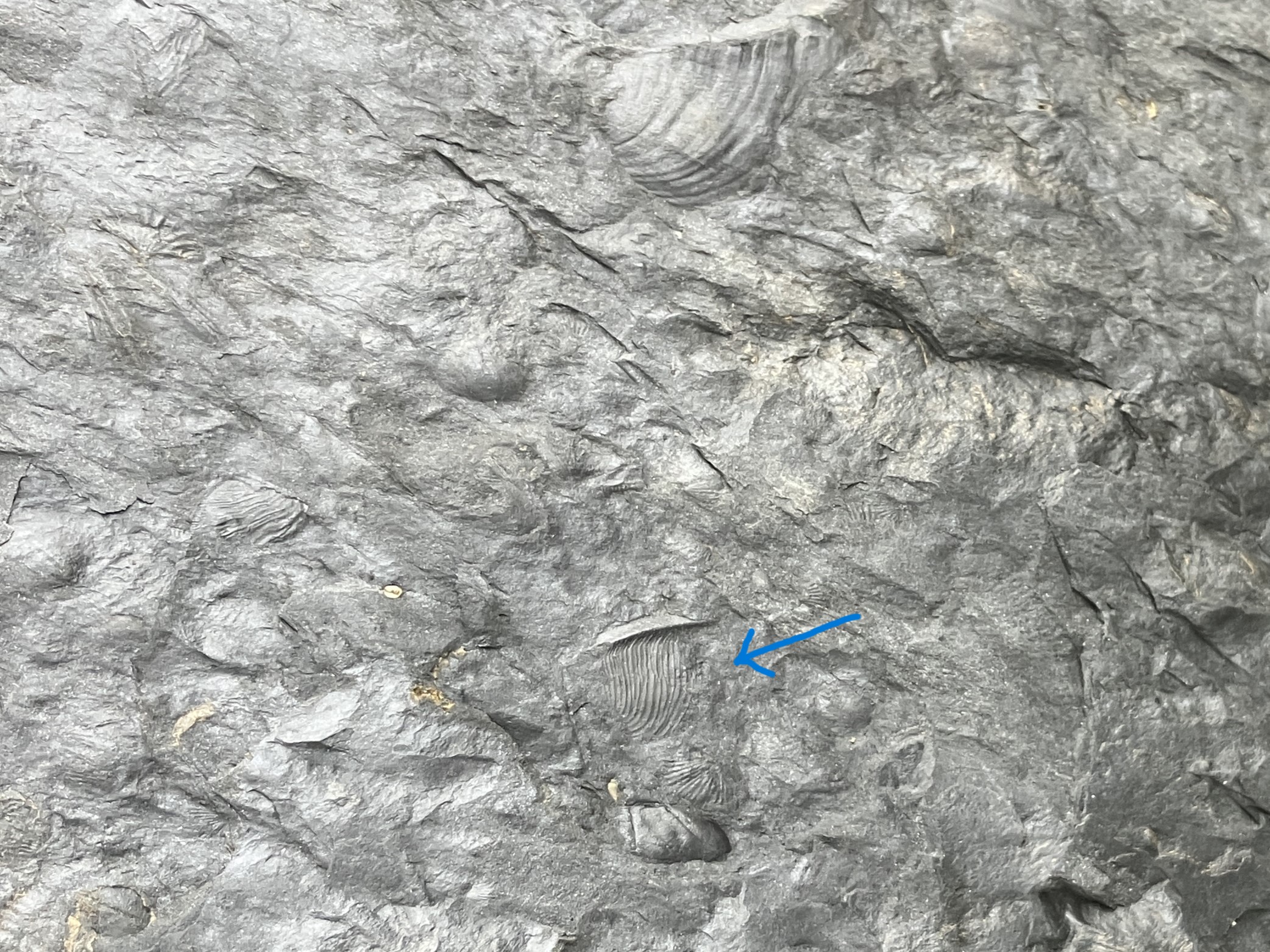 Op één van onze brokken steen met fossielen zien we een afdrukje (~1 cm groot) dat we niet goed kunnen thuisbrengen als zijnde van een brachiopode of bivalve afgaande op de gegolfde lijnen die het afdrukje laat zien. Het doet me meer denken aan de sutuurlijnen van een ammoniet vergelijkbaar met Teicherticeras cf. senior., welke in de publicatie van Anthonie genoemd wordt. Echter, ammonieten uit Steffeshausen zijn heel zeldzaam heb ik begrepen dus de kans op een ammonietenvondst acht ik zeer klein.